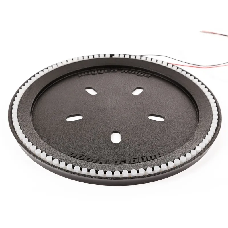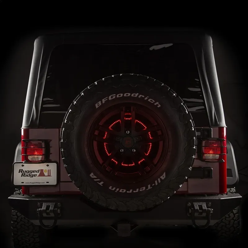 If you have "lifted" your Jeep or have a larger-than-stock spare wheel and tire on the back, chances are your high-mount third brake light has either been deleted or is no longer as visible as it once was, making it less than effective. Rugged Ridge has the perfect solution to restore your Jeep to factory safety standards AND increase the cool factor at the same time! The Rugged Ridge Third Brake Light LED Ring adds a surprisingly brilliant ring of torch-red LED's behind your spare tire- guaranteed to grab the full attention of all who are near. Designed to work with various rim diameters from 15 to 20-inches on Jeep CJ / YJ / TJ and JK models having either a 5 lug bolt patterns with 4.5, 5 or 5.5" spacing. Fitted with waterproof connectors, this Third Brake Light LED Ring is impervious to the elements for consistent all-weather performance. Imagine a world where nobody can ever say "I didn't realize he was stopping". Patent Pending