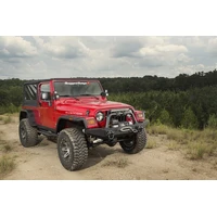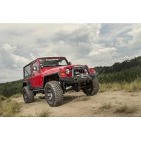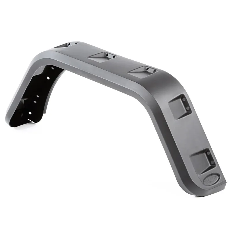 The Rugged Ridge Hurricane Flat Fender Flares feature a unique double bolt pocket as a modern spin on classic pocket flare styling. Engineered for both form and function, the fender flare's unique shape complements the Wrangler's rugged looks and lines, while mounting high up on the fender for extra clearance for oversized wheels and tires and thereby offering 2.89-inch more tire coverage and 1-inch more tire clearance over similar OE designs. Each flare features a 2-inch larger wheel opening allowing for larger wheel/tire combos. Each 6.68-inch wide fender flare is constructed from durable black injection molded thermoplastic that can be painted or left unfinished. The Hurricane Flat Fender Flares come complete with a set of durable black corrosion resistant fasteners. US Patent No. D778,795.