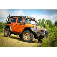 The new Sherpa Roof Rack System by Rugged Ridge for the 07-14 Jeep Wrangler JK is an easy bolt-on solution for 2 or 4-door Wrangler that require no modifications to the body of your Jeep. The unique tilt feature allows you to access your soft top with ease, and the hard top or freedom panels can be removed without removing the rack system. As an added bonus, the forward mounting bar acts as an integrated light bar. The Roof Rack System accepts the Rugged Ridge drop down light bracket (PN 11232.22) to mount up to 4 lights. We do not recommend using a roof top tent with this product.
