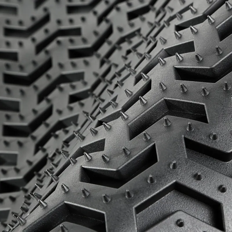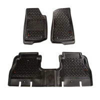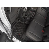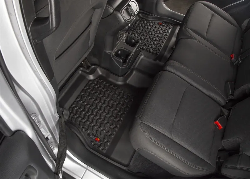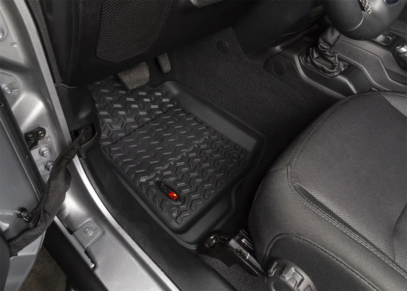 Need an affordable solution to keep the cabin floors of your Jeep looking factory fresh? Try Rugged Ridge's All Terrain Floor Liners! Made of a durable OE-quality thermoplastic material that can withstand the rigor of daily abuse, each liner is perfectly contoured to your vehicle's floor for precise secure fitment (floor hook attachment where applicable). The raised lip captures all spills, water and debris keeping your interior pristine. Features a chevron shape patented deep tread technology. Patent 8,173,369, D627,285