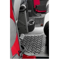 Need an affordable solution to keep the cabin floors of your Jeep looking factory fresh? Try Rugged Ridges All Terrain Floor Liners! Made of a durable OE-quality thermoplastic material that can withstand the rigor of daily abuse, each liner is perfectly contoured to your vehicles floor for precise secure fitment (floor hook attachment where applicable). The raised lip captures all spills, water and debris keeping your interior pristine. Features a chevron shape patented deep tread technology. Patent 8,163,369, D627,285, 2,699,641