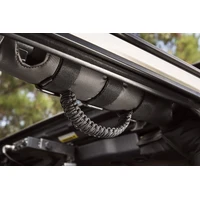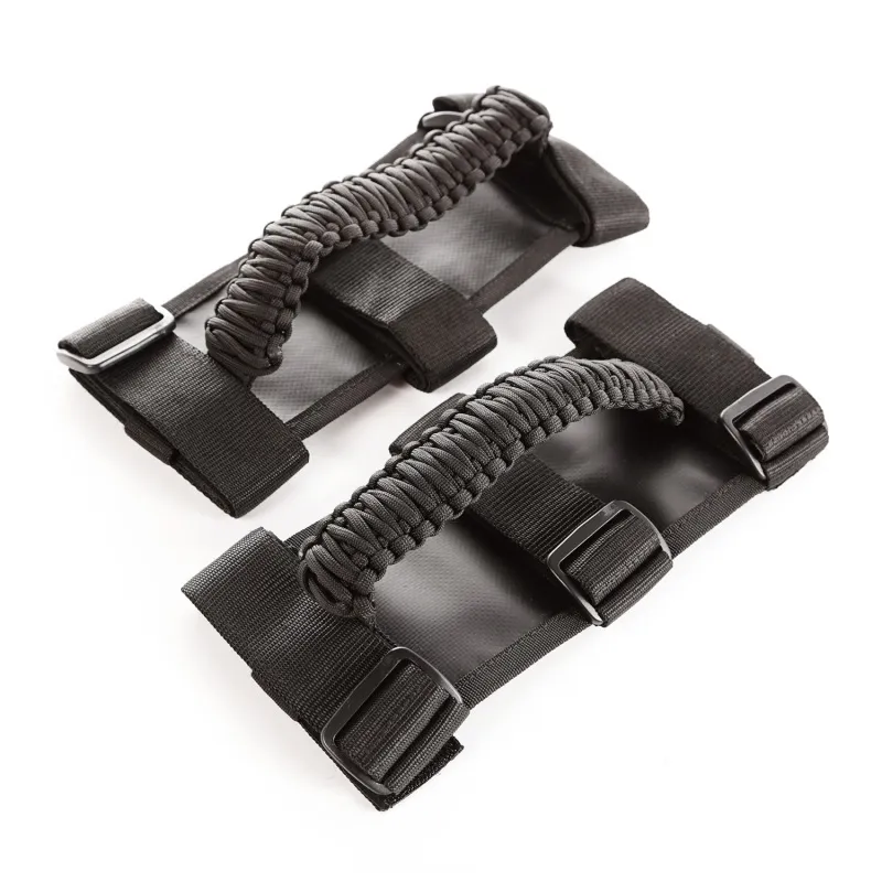 Rugged Ridge Paracord Grab Handles are constructed of durable 550 nylon parachute cord that is woven into a brawny 'Double Cobra' style knot that feels substantial in your grasp. Each handle secures to two OR three- in. diameter roll bars with heavy duty hook and loop straps for a firm and stable fitment. Your Jeep will love the attractive tactical styling, not to mention how much you'll love the assistance getting in and out of your rig! Paracord Grab Handles are available in a variety of color combinations, with one to suit any taste: Black on Black, Red on Black or Gray on Black. Sold in pairs.