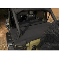 When used in unison with the Rugged Ridge Tonneau Cover (13550.04), the Tonneau Cover Extension transforms your folded rear seat into additional covered storage area; great for hauling camping gear, sports equipment, or anything you want kept under cover. Installs quickly and stores away when not in use.