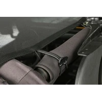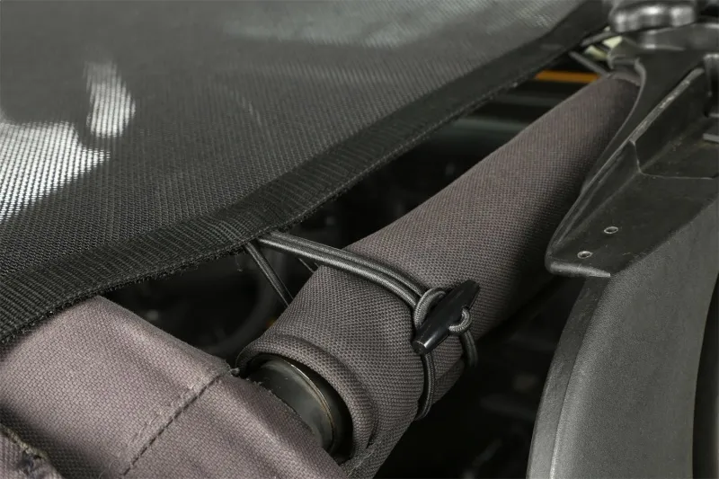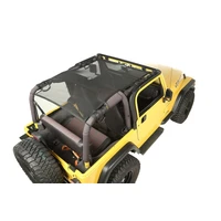 Craving that top down experience in your Jeep, but still want protection from harsh sunlight? This full-length shade protects both front and rear passengers from the sun while offering a top down feeling. With mesh construction, this sun shade is held between the windshield and the rear crossbar, eliminating the need for a header channel. The built-in elastic straps allows this design to retain access to the Jeep's top clamps, so you can keep the shade in place and still use the factory top.