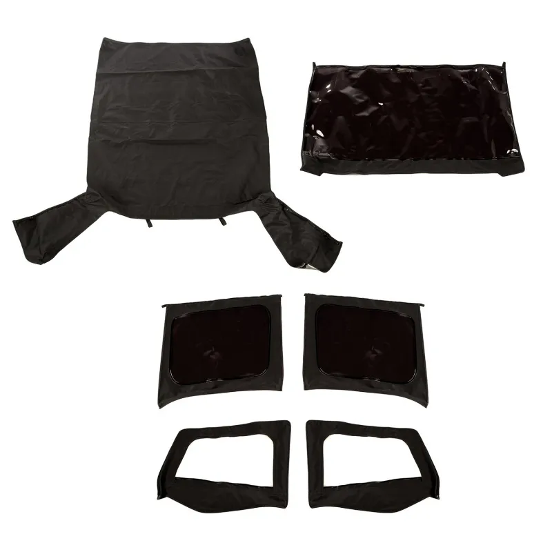 The Montana Soft Top is designed as a high-quality direct replacement for your 87-95 Wrangler YJ's factory top. Simply remove the old top and slip on the new Montana Top. The Montana Soft Top features sturdy reinforced stitching on the heavy pull areas and heavy-duty 30 mil thick rolled glass windows with a 31% tint to help keep out the direct sunlight. All Montana Soft Tops are built from 20 oz. durable vinyl coated Black Diamond polyester and cotton fabric that defies the elements. All sewn seams are double-stitched using marine grade thread for superior sun and moisture resistance. Each stitched seam is literally welded shut with a durable heat seal to repel moisture while maintaining the look of the original top. Installing the Rugged Ridge Montana Top is easy with the factory original belt rail attachment method; simply tuck the skirt under the rail and go! Each Rugged Ridge Montana Soft Top is backed by an industry leading 5-year limited warranty against manufacturer defects. Includes a set of premium door skins that work with your factory upper door frames.