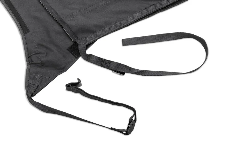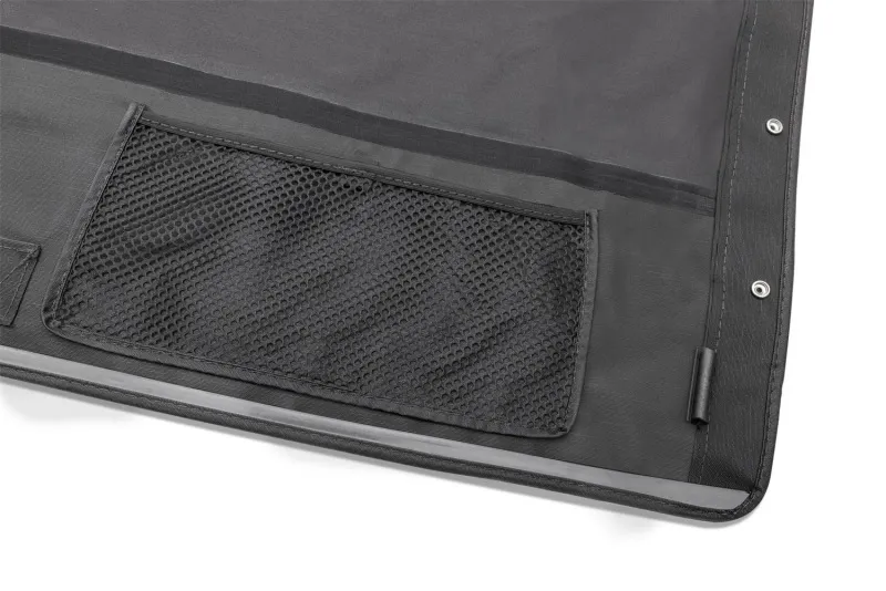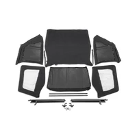 The Rugged Ridge Montana Top is the most versatile Jeep(R) soft top on the market today- combining the stunning fastback styling of a bowless top with the built-in ability to go from a fully-enclosed top to a summer brief in an instant! Best of all, no more unsightly top frame to block your view. The Montana Bowless Top fits snuggly over the factory roll bar and works with your factory door surrounds and tailgate bar, delivering a uniform weather-tight fitment with an aerodynamic style all its own. Converting to a stylish summer top is as easy as unzipping the rear windows and storing them in the rear window storage fold designed into the top. The Montana Bowless Top is made to the same strict quality standards as our factory replacement soft tops, with reinforced stitching on heavy pull areas, as well as heavy-duty 30 mil-thick DOT-approved 31% tint window glass, durable vinyl-coated polyester and cotton fabrics, and seams stitched entirely using marine grade thread to resist fading and deterioration from extended exposure to the elements. Requires separate windshield header channel, OE soft top tailgate bar, and soft top door surrounds.