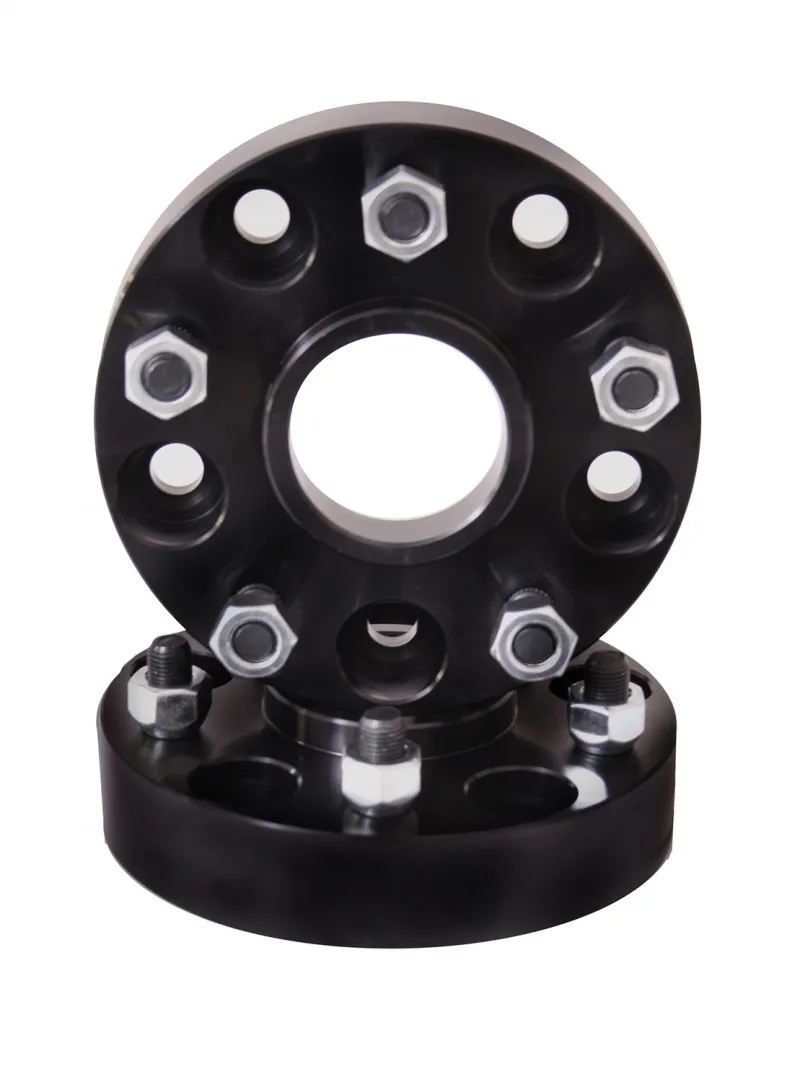 These hub centric spacer adapters move your wheels out to help fit wider tires and give your Jeep a wider track with improved stability. Constructed of double anodized black 6061T6 aluminum for long life and extra corrosion resistance. All hardware is grade-8 for extra strength. Each part number comes as a spacer pair. Included are ten pre-installed grade-8 wheel studs, ten lug nuts and a thread locker.