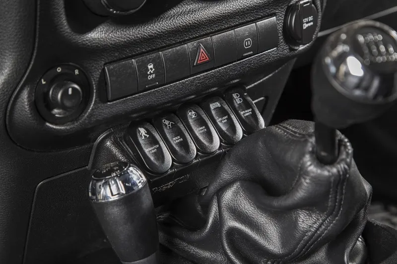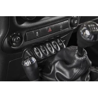 The Rugged Ridge Lower Switch Panel allows for practical & convenient installation of electrical switches in 2011-2017 Jeep Wrangler models, regardless of transmission type (Manual or Automatic). This switch panel replaces the lower center dash panel with an injection-molded panel made of an impact-resistant thermoplastic, matching the color and grain of the factory dash for a finished look. Each Switch Panel Kit includes the switch panel and FIVE laser-etched 2-position rocker switches (Zombie Lights, Light Bar Lights, Sasquatch Lights, Rock Lights and Off-Road Lights)