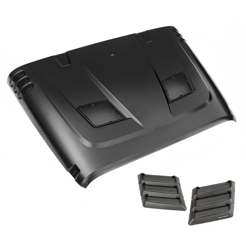 Remove the heat, maximize your engine performance, and add a little flair to your Jeep exterior with this Performance Vented Hood kit from Rugged Ridge that combines the function of the Performance Vented Hood (17759.01) and the aggressive off-road style of the hood vents (17759.09) Made of stamped steel and a factory inner core, the Performance Vented Hood fits like the original yet allows more heat to escape from the engine compartment than other hoods on the market today. The SRT inspired design gives a great aggressive look. Vents are removable to make it easier to paint. Uses factory attachment points and more aftermarket accessories will simply bolt into place. Got heat? You need this kit!