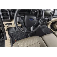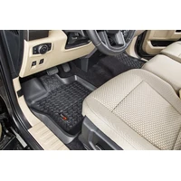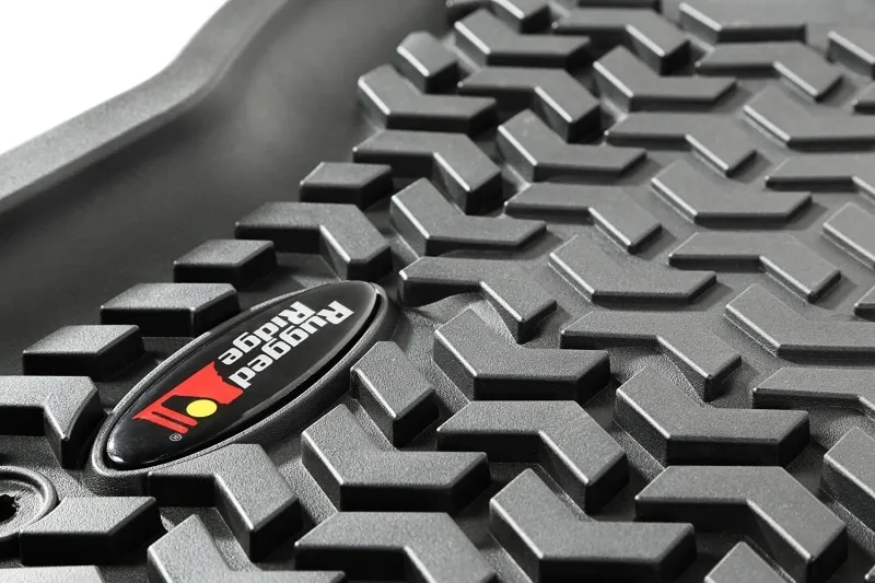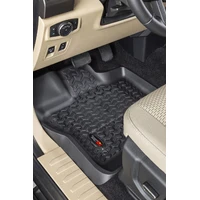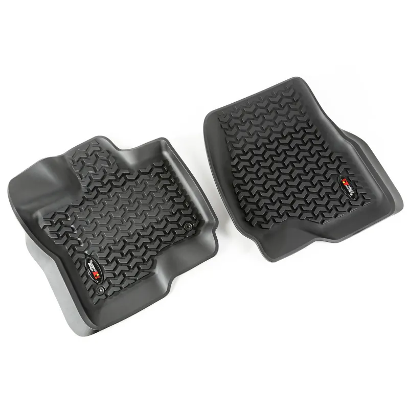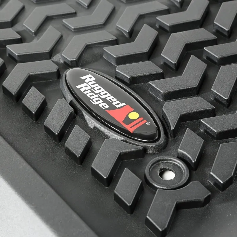 This pair of black front floor liners from Rugged Ridge provides complete protection for the cabin floor of your vehicle while keeping it looking factory fresh. Each liner is perfectly contoured to your vehicle's floor for precise secure fitment (floor hook attachment where applicable). The raised lip captures all spills, water and debris keeping your interior pristine. The chevron-shape patented deep tread technology channels liquid away from your shoes keeping them dry. Made of a durable OE-quality thermoplastic material that can withstand the rigor of daily abuse. Backed by our limited lifetime warranty.