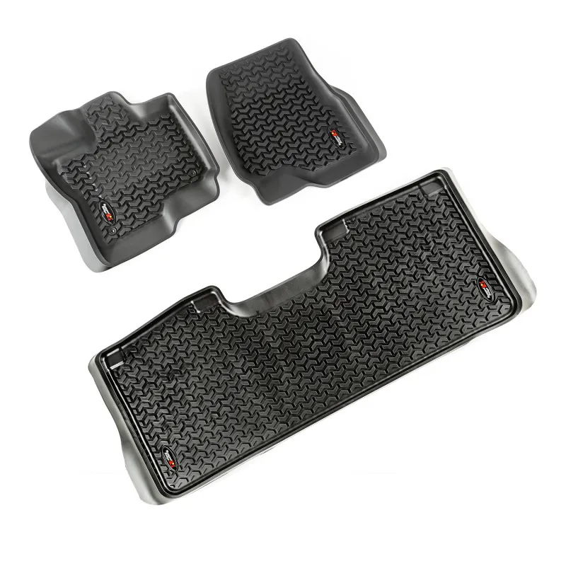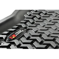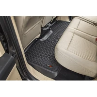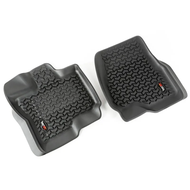 Rugged Ridge Floor liners provide complete protection for the cabin floor of your vehicle while keeping it looking factory fresh. Each liner is perfectly contoured to your vehicle's floor for precise secure fitment (floor hook attachment where applicable). The raised lip captures all spills, water and debris keeping your interior pristine. The Chevron-shape patented Deep Tread Technology channels liquid away from your shoes keeping them dry. Made of a durable OE-quality Thermoplastic material that can withstand the rigor of daily abuse. Backed by our Limited Lifetime Warranty. Patent No. 8,163,369; D627,285; 2,699,641
