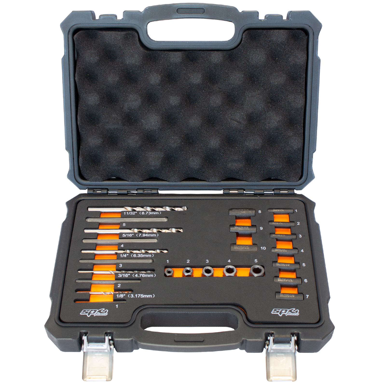 • 10x Stud Drilling Guides: 9/32, 5/16, 11/32, 3/8, 13/32, 7/16, 15/32, 1/2, 17/32 & 9/16"