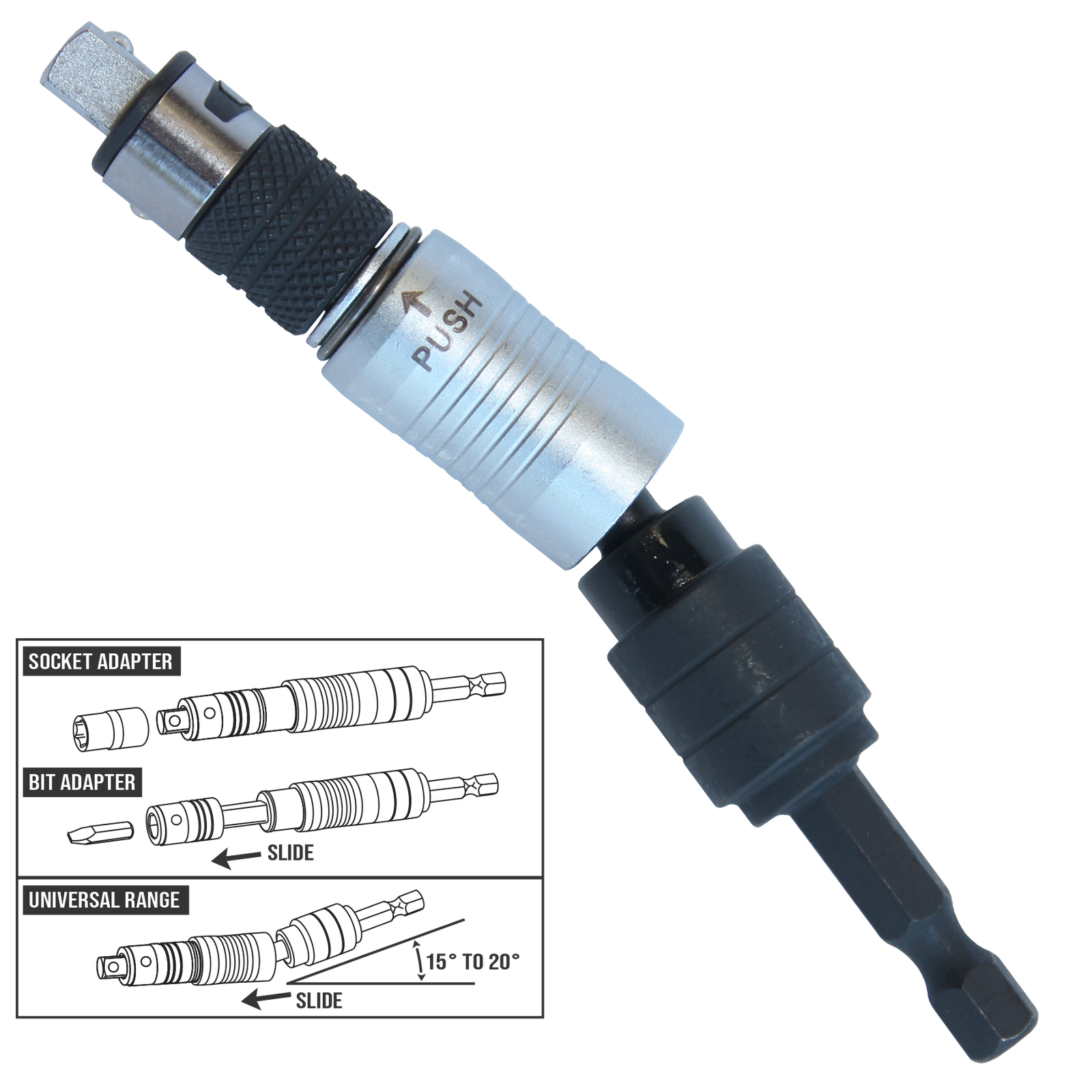• Converts from 1/4" square drive to 1/4" hex drive - Sockets and bits can be easily be changed via a push-pull mechanism. Pull the sleeve down to expose the 1/4" drive socket holder, and push the sleeve back up to expose the 1/4" Hex receptor