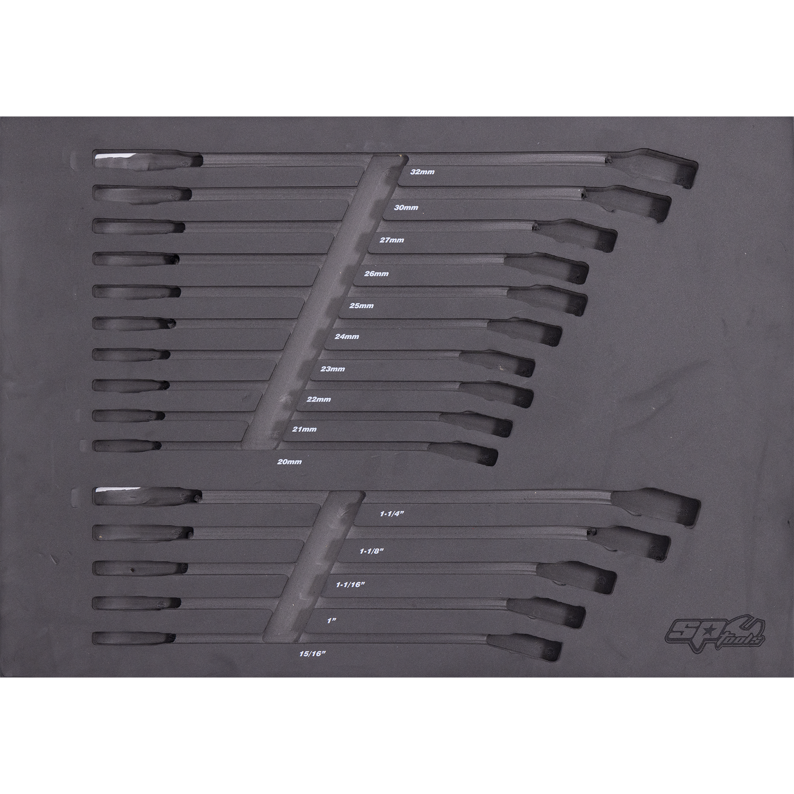 • EVA Hi-Density Foam Storage inserts - cut to shadow your tools.Offers extra protection for your SP ToolsKeeps your tool kit organised for rapid tool location and instant useEasy identification of missing toolsDIMENSIONS560w x 400d (mm)THIS EMPTY EVA FOAM TRAY BEST FITS THE FOLLOWING TOOLS(NOT INCLUDED)EVA Foam Tray Tool Kit - Spanners - 15pc - Metric & SAE (SP50016)QUAD DRIVE COMBINATION SPANNERS20, 21, 22, 23, 24, 25, 26, 27, 30 & 32mm15/16, 1, 1-1/16, 1-1/8 & 1-1/4"NOTE:This EVA foam trayDOES NOTInclude tools