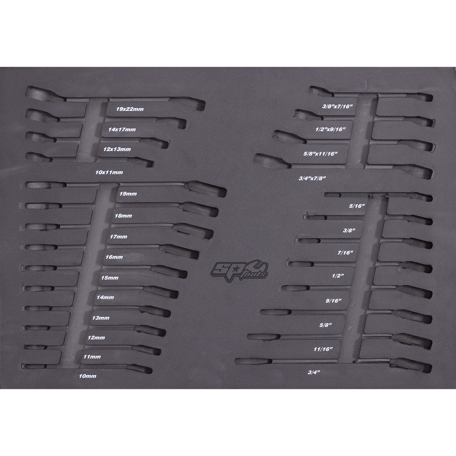 • EVA Hi-Density Foam Storage inserts - cut to shadow your tools.Offers extra protection for your SP ToolsKeeps your tool kit organised for rapid tool location and instant useEasy identification of missing toolsDIMENSIONS560w x 400d (mm)THIS EMPTY EVA FOAM TRAY BEST FITS THE FOLLOWING TOOLS(NOT INCLUDED)EVA Foam Tray Tool Kit - Spanners - 26pc - Metric & SAE (SP50020)FLARE NUT SPANNERS10x11, 12x13, 14x17 & 19x22mm3/8x7/16, 1/2x9/16, 5/8x11/16 & 3/4x7/8"GEAR DRIVE QUAD DRIVE SPANNERS10, 11, 12, 13, 14, 15, 16, 17, 18 & 19mm5/16, 3/8, 7/16, 1/2, 9/16, 5/8, 11/16 & 3/4"NOTE:This EVA foam trayDOES NOTInclude tools