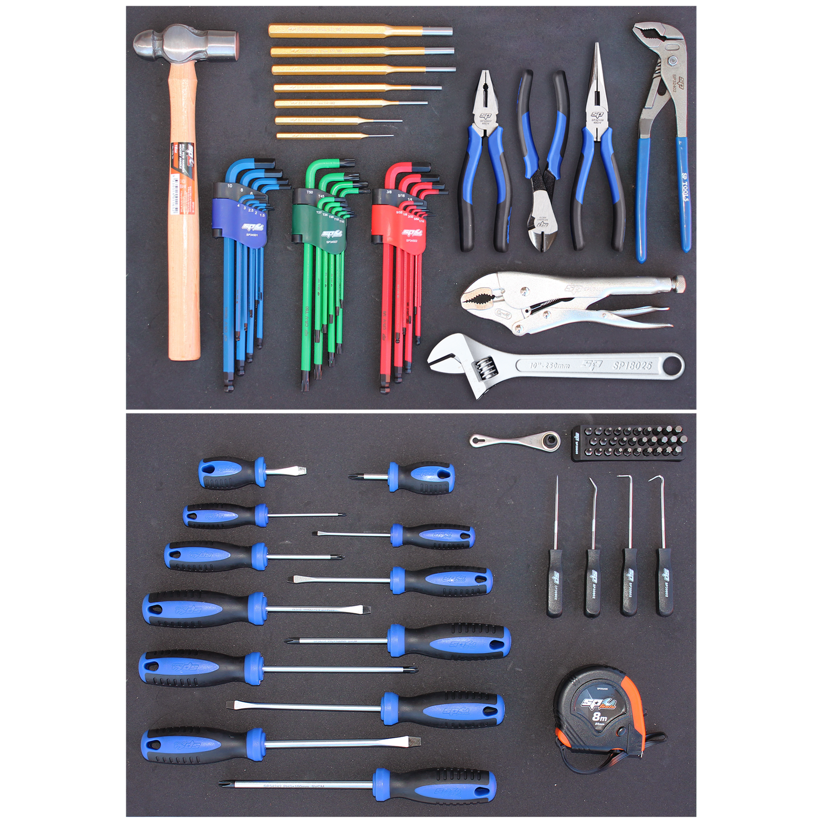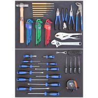 • TOOLS INCLUDED IN THIS TOOL KITScrewdrivers - 3.0x75, 5.5x100, 6.5x38, 6.5x100, 6.5x150 & 8.0x150mmScrewdrivers - #0x75, #1x75, #2x38, #2x100, #2x150 & #3x150mmRatchet Driver Bit Set - 31pcHex Keys - 1.5, 2, 2.5, 3, 4, 5, 6, 8 & 10mmHex Keys - 1/16, 5/64, 3/32, 1/8, 5/32, 3/16, 1/4, 5/16 & 3/8"Torx Keys -T10, T15, T20, T25, T27, T30, T40, T45 & T50Pliers - Combination, Long Nose, Multigrips & LockingCutters - DiagonalAdjustable WrenchHammer - Ball PeinPin Punch Set - 7pcPick Set - 4pcTape Measure*Images are for illustration purposes only, contents may vary.NOTE: Tools only, No EVA foam tray included