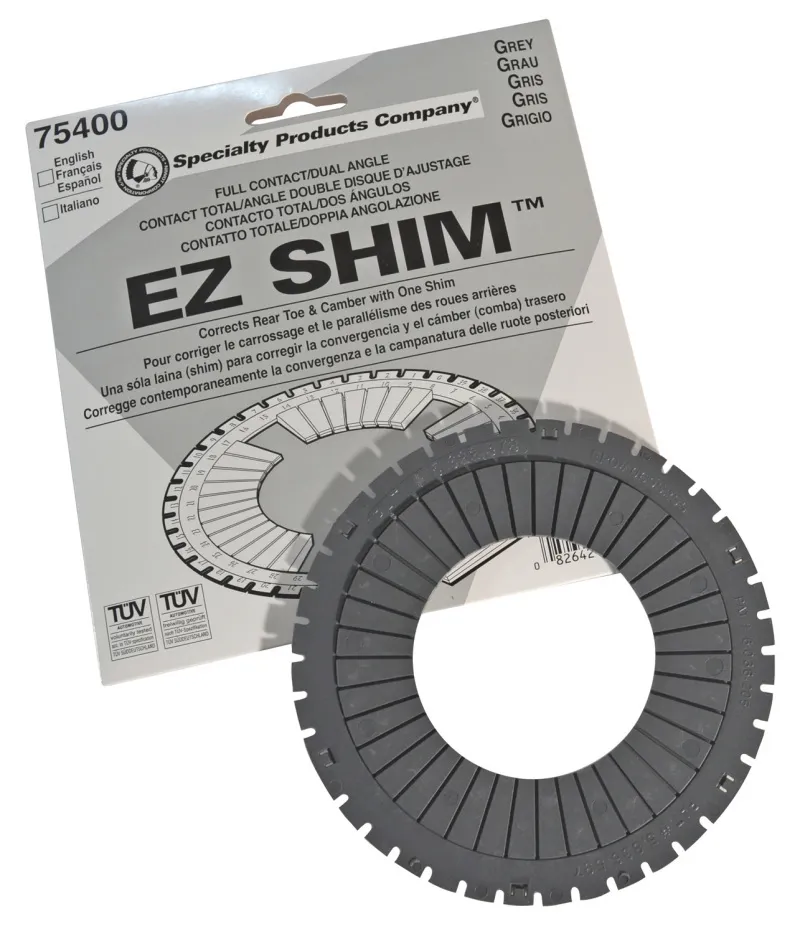A patented Full Contact Dual Angle Shim, that corrects Toe and Camber with one shim. These two-piece adjustable shims are available in 4 sizes which cover many rear shimable FWD vehicles. Durable construction, proven adjustment changes within .03 degrees toe and .01 degrees camber. CAUTION: Check for caliper to rotor clearance when installing this part on vehicles equipped with rear disc brakes. Some vehicles may require the use of longer bolts. Recommend use of 10408 bolts and 75970 spacers as required. Recommend use of 75915 Shim Cutter. 75910 Dial Chart and EZ SHim Online available for setting shims. California Residents WARNING