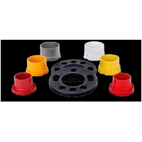Through-hole system with multi hole circle bores and patented adapter rings for vehicles with wheel bolts AND wheel studs. By the flat plastic adapter ring this system is centered on the wheel hub up to a change of track width by 10 mm per wheel and it provides an optimal run. The high plastic adapter ring offers a double centering on the wheel hub and for the rim from a track width change of 12,5 mm per wheel and therefore it ensures an optimal run. The universal bolt holes allow the use at vehicles with 4 and 5 hole connections and up to 7 different pitch circle diameters. Longer wheel bolts or ST shaft nuts are required (please order separately, unless otherwise noted).