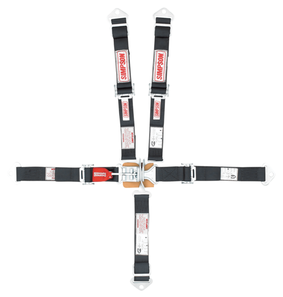 SFI 16.1 certified 5 point, latch and lock, pull down belt, individual shoulder harness.