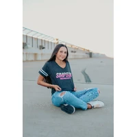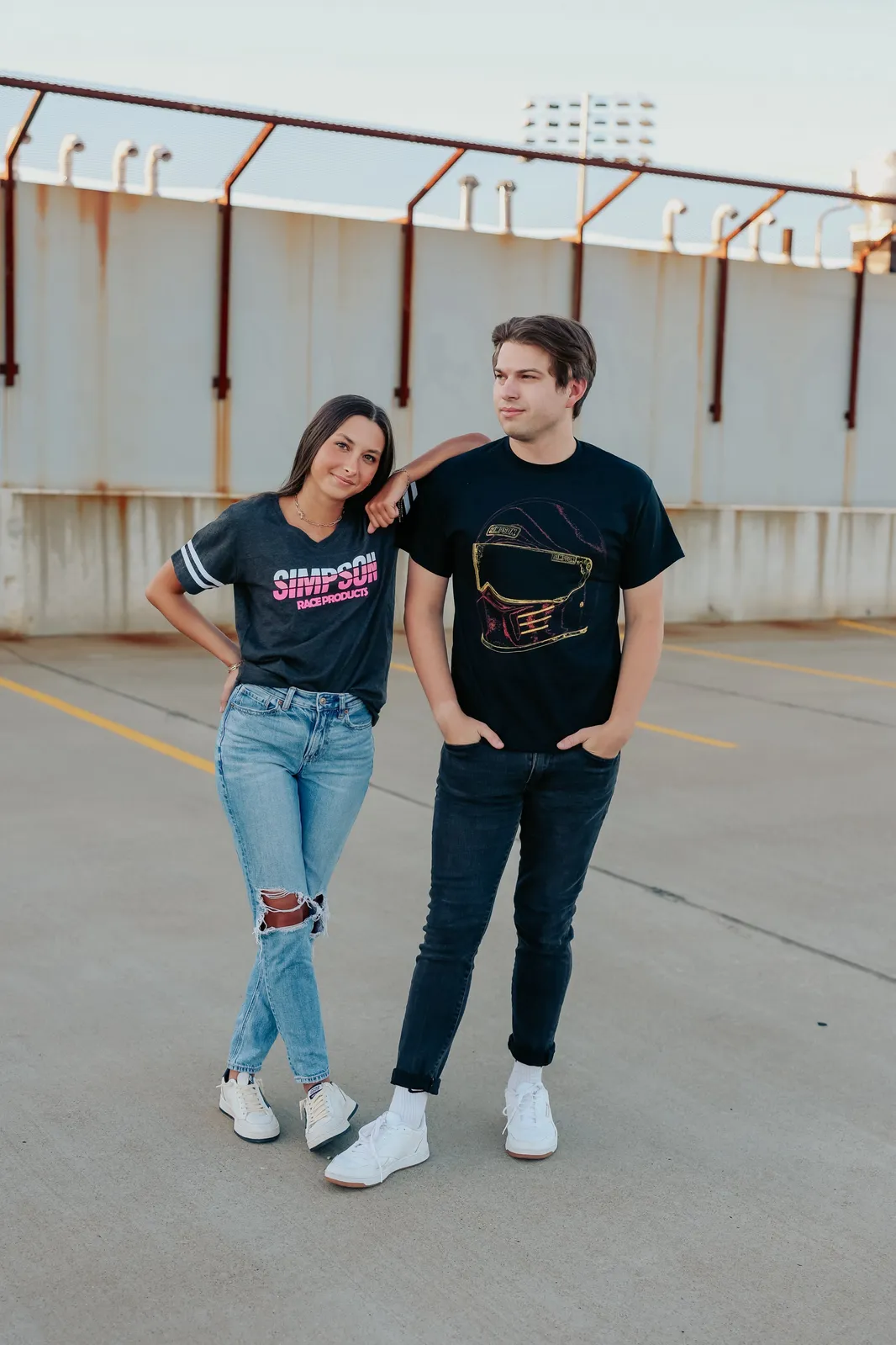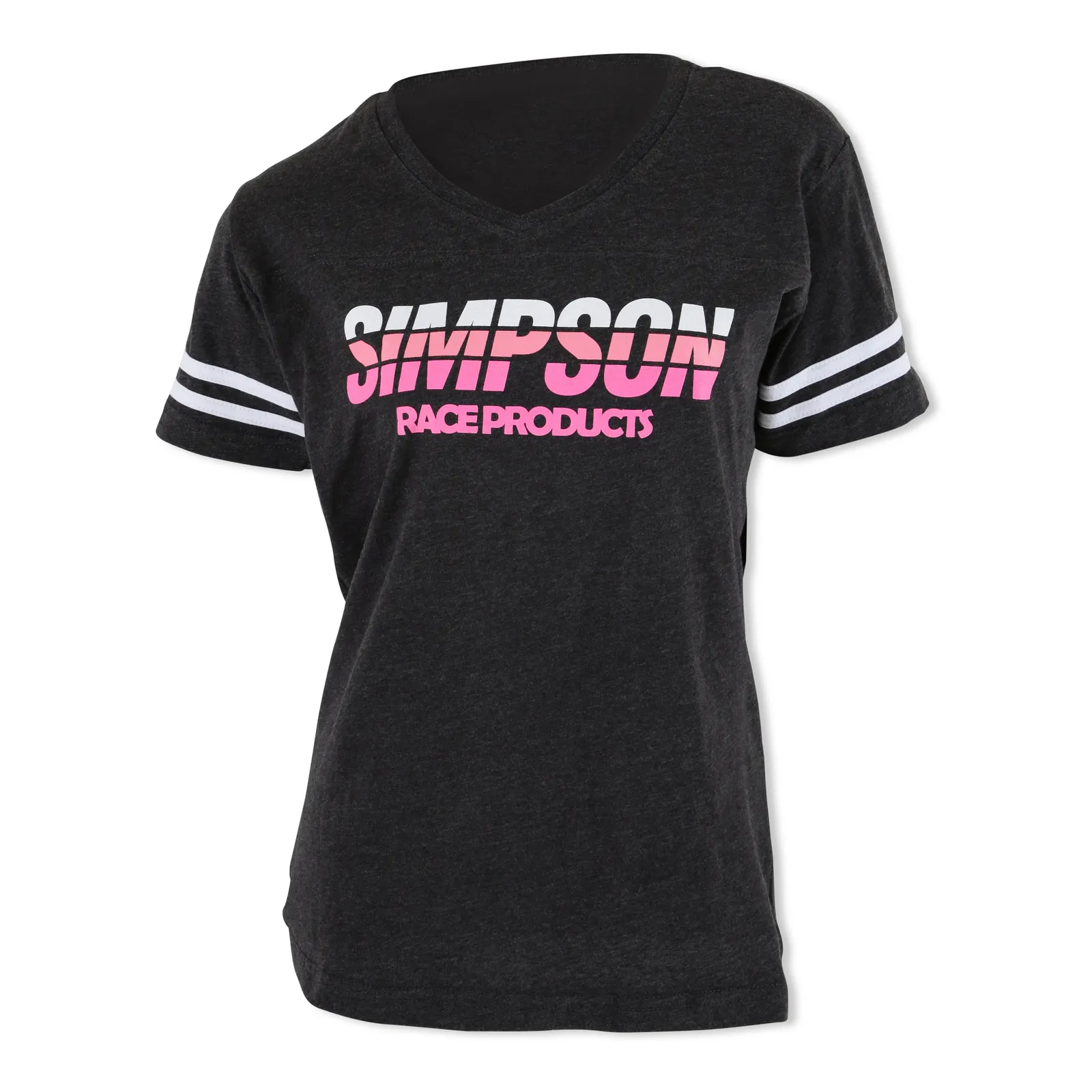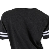 Fun v-neck T-Shirt with striped sleeves for style and 60/40 combed ring-spun cotton/poly blend for comfort.