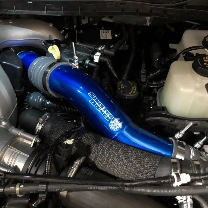 The Sinister Diesel Charge Pipe Kit for the Powerstroke 6.7L replaces the stock, restrictive piping that connects the turbocharger to your intercooler. This upgraded pipe is larger in diameter and has smooth mandrel bends to increase air flow velocity to improve power and lower EGTs. The Sinister Charge Pipe Kit is also more durable, being made from 6061 Aluminum alloy and connected with Sinister Diesel's 4-ply silicone boots that are rated up to 400psi. Our Intercooler Pipes are masterfully back-purge TIG welded and finished in polished powdercoated Sinister Blue for a beautiful under-hood look.Every Sinister Diesel part is manufactured and tested at Sinister'California headquarters and comes with the legendary Sinister. Don't let a factory pipe rob your engine of power and efficiency; get the Sinister Diesel 2017-2021 Powerstroke 6.7L charge pipe kit!, Features and Benefits:6061 Aluminum Alloy Construction., CNC Mandrel Precision 3" Bent Tubing for a Perfect Fit, 4-Ply Silicone Boots that are rated to 400psi, Stainless Steel Spring Boot Clamps for a Reliable Seal, Powder Coated and Polished in Sinister BlueKit Includes:(1) Hot Side Charge Pipe, (1) Cold Side Charge Pipe, (3) Silicone Boots, (6) Stainless Steel Spring Clamps.