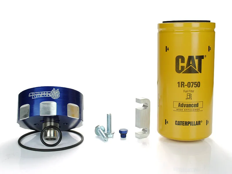 If you want to ensure maximum protection for your GM diesel engine's fuel system, then be sure to check out this upgraded Duramax fuel filter. Instead of a the factory fuel filter, the Sinister Diesel Duramax fuel filter and adapter kit comes with everything that you will need to upgrade to an ultra-fine 2 micron fuel filter on the 2001 to 2016 Chevrolet Silverado and GMC Sierra 2500 and 3500 Heavy Duty pickup trucks equipped with the 6.6L Duramax V-8., The spin-on filter from Caterpillar improves both the efficiency and capacity of the engine's fuel filtration system reducing long-term repair and maintenance costs while prolonging the life of your fuel system and diesel injectors. The adapter is made from CNC billet aluminum construction with Sinister Diesel's signature blue anodized finish, and the upgrade does not require any modifications to be installed., This Duramax fuel filter adapter kit includes the fuel filter adapter base, an ultra-fine 2 micron fuel filter from Caterpillar and all of the hardware and o-rings required for the install. This adapter kit is manufactured and tested at Sinister Diesel's California headquarters, and it comes with the legendary Sinister., Features:Improved Filtration Efficiency, CNC Billet Aluminum Construction, Blue Anodized FinishKit Includes:(1) Sinister Diesel CAT Fuel Filter Adapter, (1) Stand Off Space with hardware, (1) Ultra-fine 2 Micron CAT Fuel FilterSpare Replacement CAT Fuel Filters can be found.