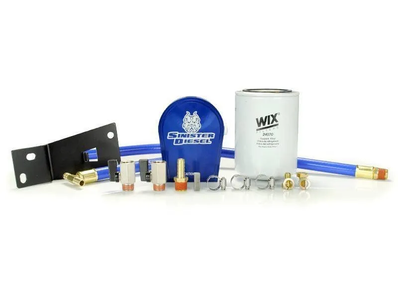 Removing contaminates such as the casting sand and metal shavings means your engine's water pump, EGR cooler and oil cooler will last longer. This kit is designed to bypass and filter small amounts of the engine'coolant while your diesel engine is running. The CNC machined billet 6061 aluminum anodized construction filter block attaches to a supplied bracket, which mounts to factory holes so no drilling is required. Filter block includes 2 threaded inlet ports and 1 outlet port. This kit includes all fittings needed for installation. The filter can be easily unscrewed for replacement. We recommend replacement of the first filter at 500 miles with replacement of the second and third filters is at 3,000 miles each. After 3 changes, filter replacement can be done once a year. The silicone hoses fittings are pre-assembled for simple, leak-proof connections that factory tested at twice the recommended radiator cap pressure.; Features: Construction - 6061 Aluminum Filter Block, Silicone Hose, Product Design - CNC Machined 6061 Aluminum, Anodized in Sinister Blue, Performance Notes - Cleaner coolant for longer engine life, Special Note - Recommended Tools: 9/16 , 13/16 wrench, 8mm socket, 3/8 12 point socket or 5/16 combination wrench, large adjustable wrench, regular screw driver, utility knife, diagonal cutters;Includes:Genuine WIX Coolant Filter, Filter Block, Mounting Bracket, Installation Hardware