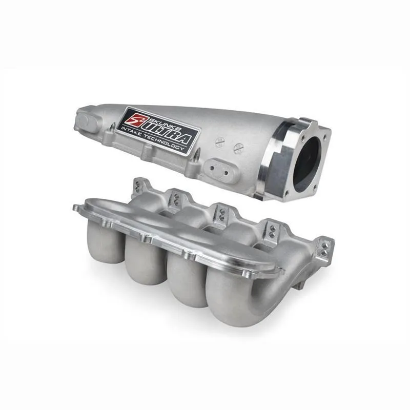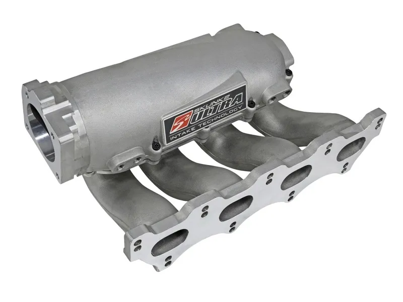 The Ultra Series is years of research and development, culminated in a multi-piece cast aluminum intake manifold that offers advantages that only a modular design could allow. Using the latest in CFD (Computational Fluid Dynamics) software; Skunk2 Racing has created a two-piece modular design that allows for easy disassembly, porting, and plenum volume changes through the use of a removable plenum lid and optional plenum spacers. In addition to CFD testing, the Ultra Series Intake Manifold has undergone extensive in-house dyno testing which has led to a design that is less restrictive, yielding both torque and power gains well over many of the competitors. Skunk2 Racing Ultra Street Intake Manifolds are cast-aluminum, manufactured from high-grade 356 aluminum alloy for strength and lightweight. Each manifold is CNC-machined for a precise fit, and individually inspected for quality assurance. The Ultra Series Street manifold features a generous throttle body opening and is constructed with thick walls at entry, minimizing concerns of breakthrough when port matching. Intense planning and design went into the plenum to distribute even airflow to all four cylinders under dynamic load conditions. Placement and design of the velocity stacks were rigorously flow tested to ensure maximum delivery of air to the cylinder. Large velocity stack raised bell mouth entries lead to intake runners with smooth transitions allowing the Ultra Street Intake Manifold to really move some air! Skunk2 Racing Ultra Street Intake Manifolds are designed to be used in modified naturally aspirated applications as well as mild turbo/supercharged setups. *FEATURES:* * Modular 2pc. Design w/ Removable Plenum * Rotatable Plenum Allows Driver-side or Passenger-Side Throttle Body Mounting * Tapered High-Velocity Runners w/ Raised Velocity Stack Entries * Generously Cast Runner Walls for Porting * Large Throttle Body Opening * Lightweight 356 Aluminum Alloy Construction * Hi-Grade Mounting Hardware * Thermal Gasket Included