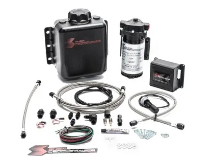 Unlock 50-70+HP on your boosted vehicle while decreasing your air temps by up to 100 degrees! Increase your pump gas octane by 25 points and make more power efficiently with a cooler running motor! The Snow Performance Stage 2 Boost Cooler water-methanol injection kit is available for all forced induction applications (supercharged/turbocharged) and uses a progressive controller with built in manifold absolute pressure (MAP) sensor that proportionally injects more or less water-methanol according to boost pressure. Start and full points are adjustable for engagement and delivery curve to match what the engine requires. Proportionally injecting according to boost pressure gives an accurate delivery of water-methanol and allows cooling and performance improvements over a wide range for improved drivability. Comes with adjustable progressive VC-20 engine mount controller, 4AN fittings, and stainless steel braided line to mount pump/tank in engine bay of vehicle. For trunk mount options see Part# SNO-40014-BRD, SNO-40012-BRD.
