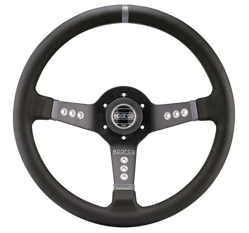 Sparco steering wheels are designed to improve grip and comfort for driving precision. Available in different diameters, depths, and materials which will satisfy every driving situation from street to track. The Sparco Piuma L777 is a black leather steering wheel with 'Veloce' embroidery on the rim. 350mm diameter, flat dish, 3 black spokes with black center ring and Sparco engraving and horn button. Grey centering mark on the top of the wheel. * Diameter - 350mm * Dish (depth front to back) - 63mm * Cover Material - Leather or Suede * Contrast stitching * Grey leather centering and accent stripes