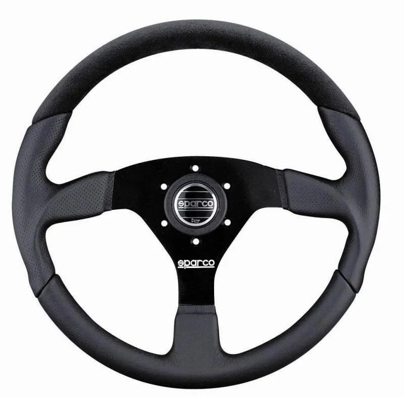 Sparco steering wheels are designed to improve grip and comfort for driving precision. Available in different diameters, depths, and materials which will satisfy every driving situation from street to track. The Sparco Lap 5 L505 steering wheel is finished in black leather and alcantara, and has a 3 spoke, flat dish with airleather grip. Black spokes and center ring. * Diameter - 350mm * Dish (depth front to back) - 33mm * Cover Material - Alcantara, Leather, Perforated Leather