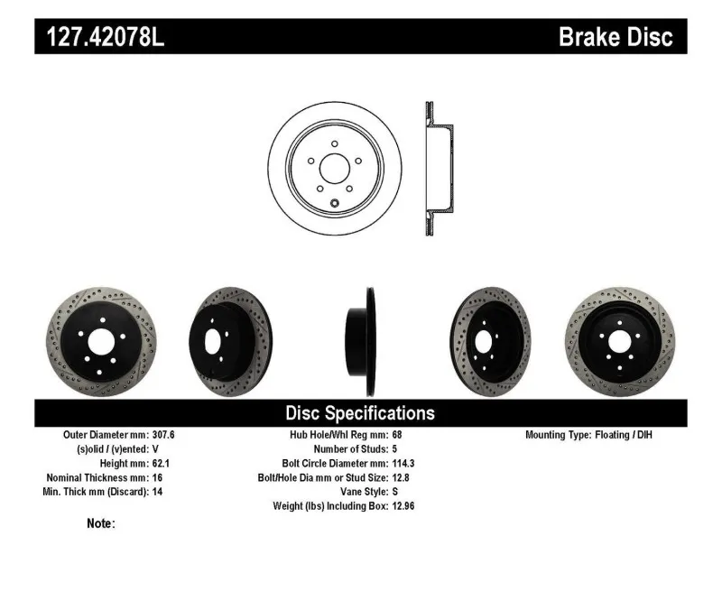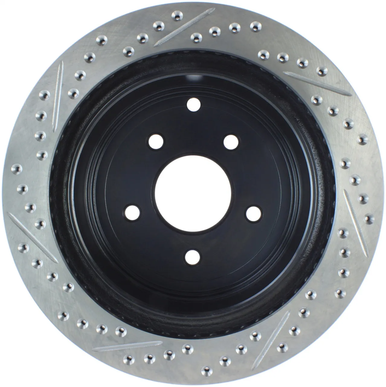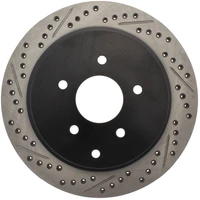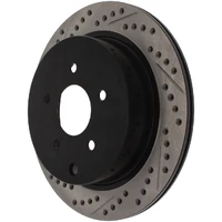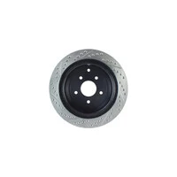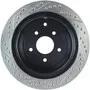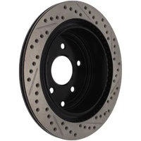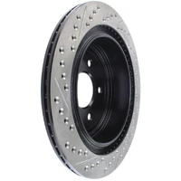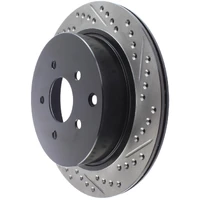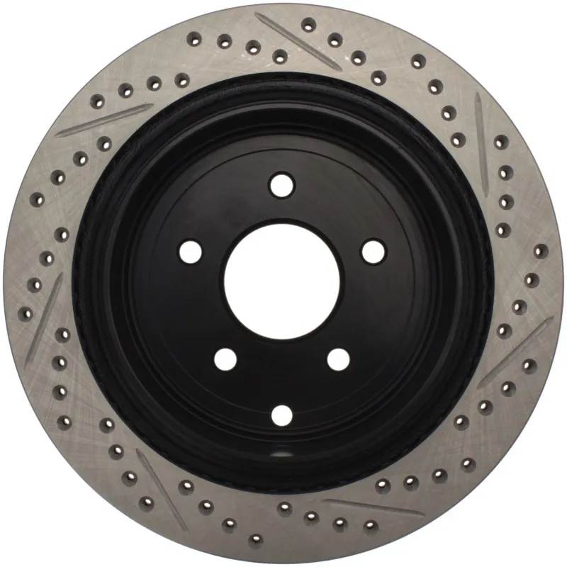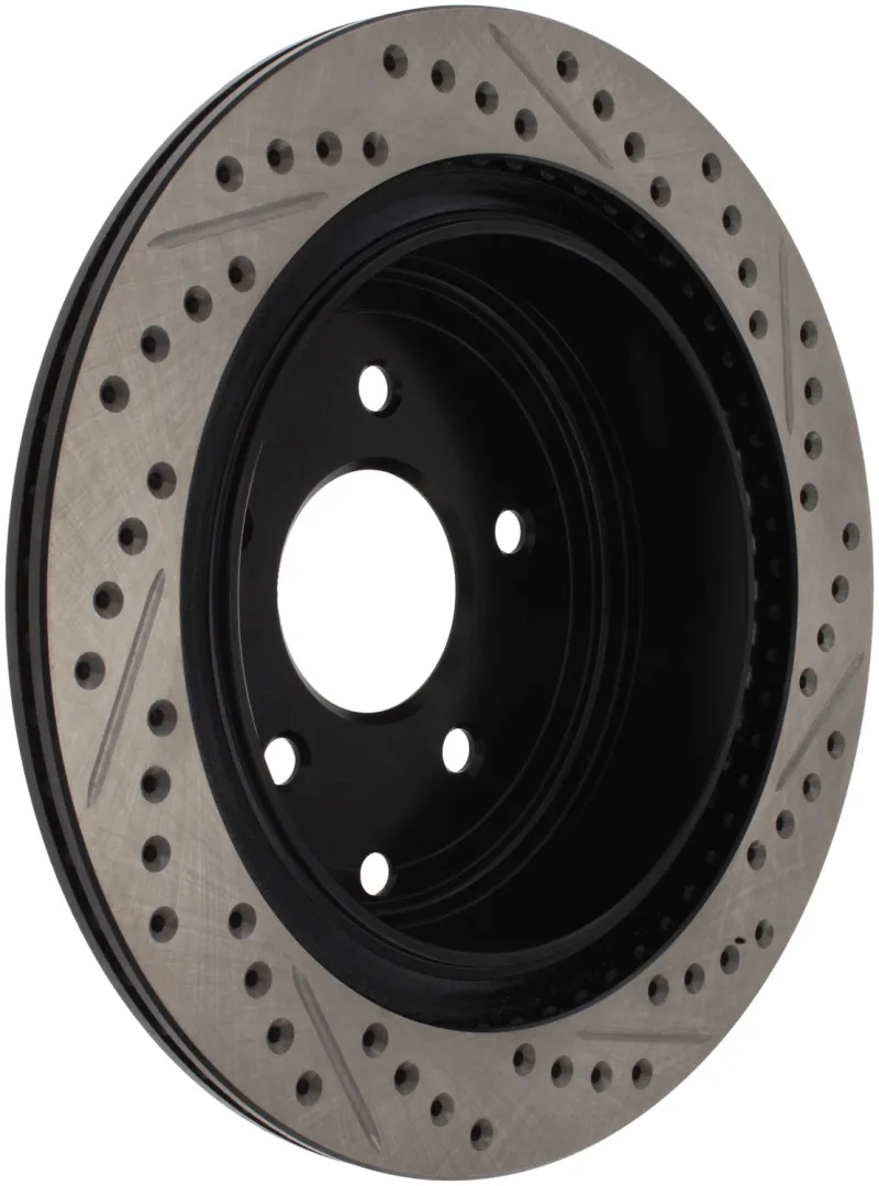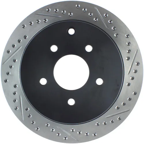 StopTech recognizes that great brakes need to look as good as they perform. Performance wheels and tires are best complemented with StopTech SportStop Cross-Drilled & Slotted rotors. SportStop Drilled & Slotted brake rotors prevent glazing of the pads, add bite and improve wet and dry braking performance. Every SportStop Drilled & Slotted brake rotor is produced from a high quality Centric Parts blank casting and finished in a durable e-coating for corrosion resistance. SportStop Drilled & Slotted rotors look great behind custom wheels, improve the initial bite of the brake pads, and help wipe away the debris that forms between the pad and the disc. A set of SportStop cross-Drilled & Slotted rear replacement rotors is a great way to match the aesthetics of a StopTech Big Brake Kit with the cross-Drilled & Slotted rotor option. *E-Coated Finish* Every SportStop rotor is finished with black e-coating on both sides of the hat, inside the the cooling vanes, and on the outside edge. E-coating is a superior electro-statically applied finish designed to withstand 400 hours of salt water exposure without rusting. This is especially important on both mounting faces of the hat where it touches the hub flange and back face of the wheel. Any accumulation of rust in these area can lead to installed lateral run out issues. *Power Alloy Metallurgy* Power Alloy metallurgy is exclusive feature of SportStop rotors. In specific vehicle applications, StopTech works with foundry partners to increase the molybdenum or carbon content of the castings, and to carefully control the cooling rate during production to reach targets for hardness and tensile strength. *Cooling Vane Design* Nearly all SportStop Cross-Drilled & Slotted rotors have unique Drilled & Slotted hole patterns for the left and right sides of the vehicle. For these directional patterns, straight vane or pillar vane rotors are used to ensure that a Drilled & Slotted hole never touches a cooling vane.