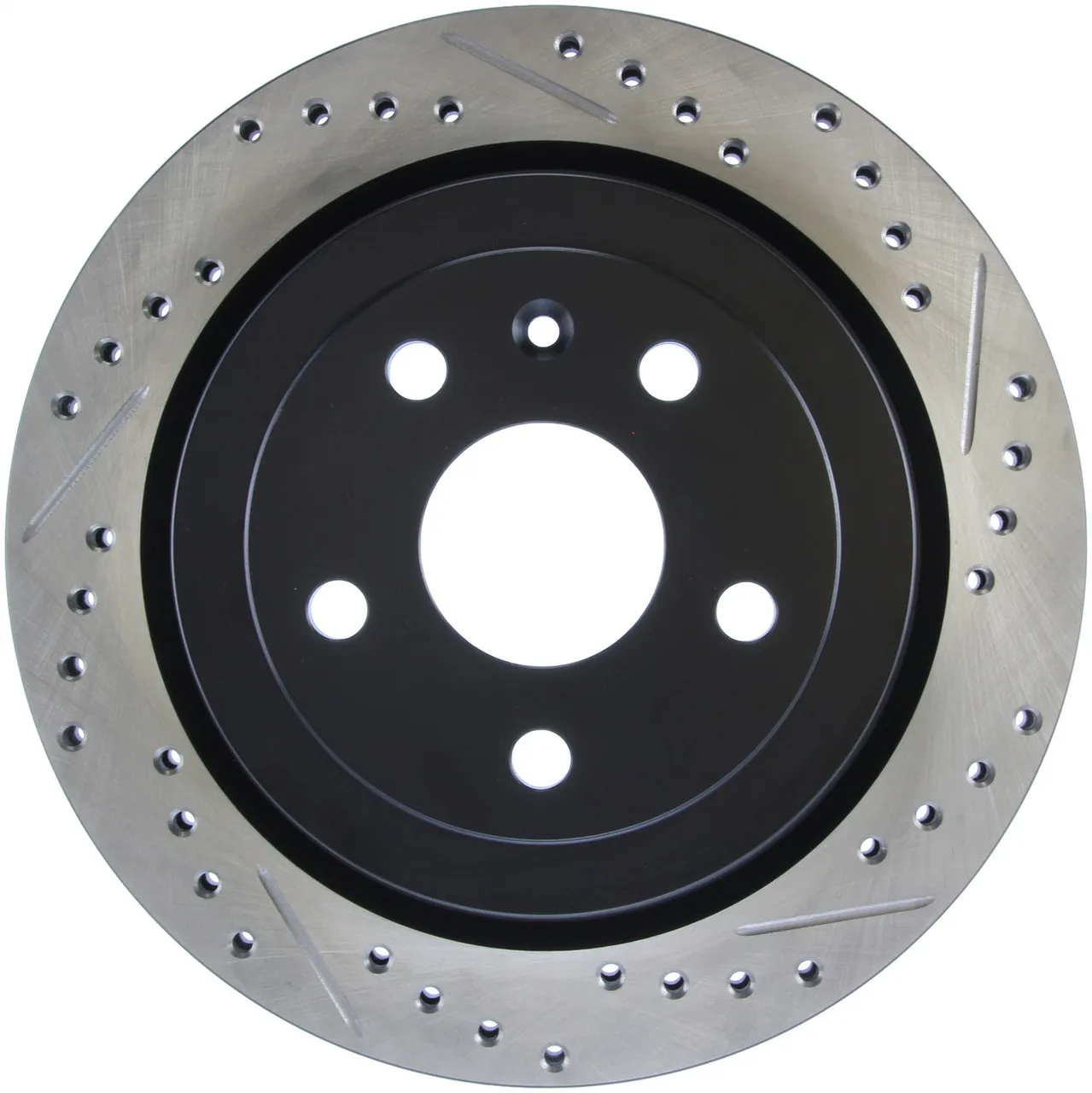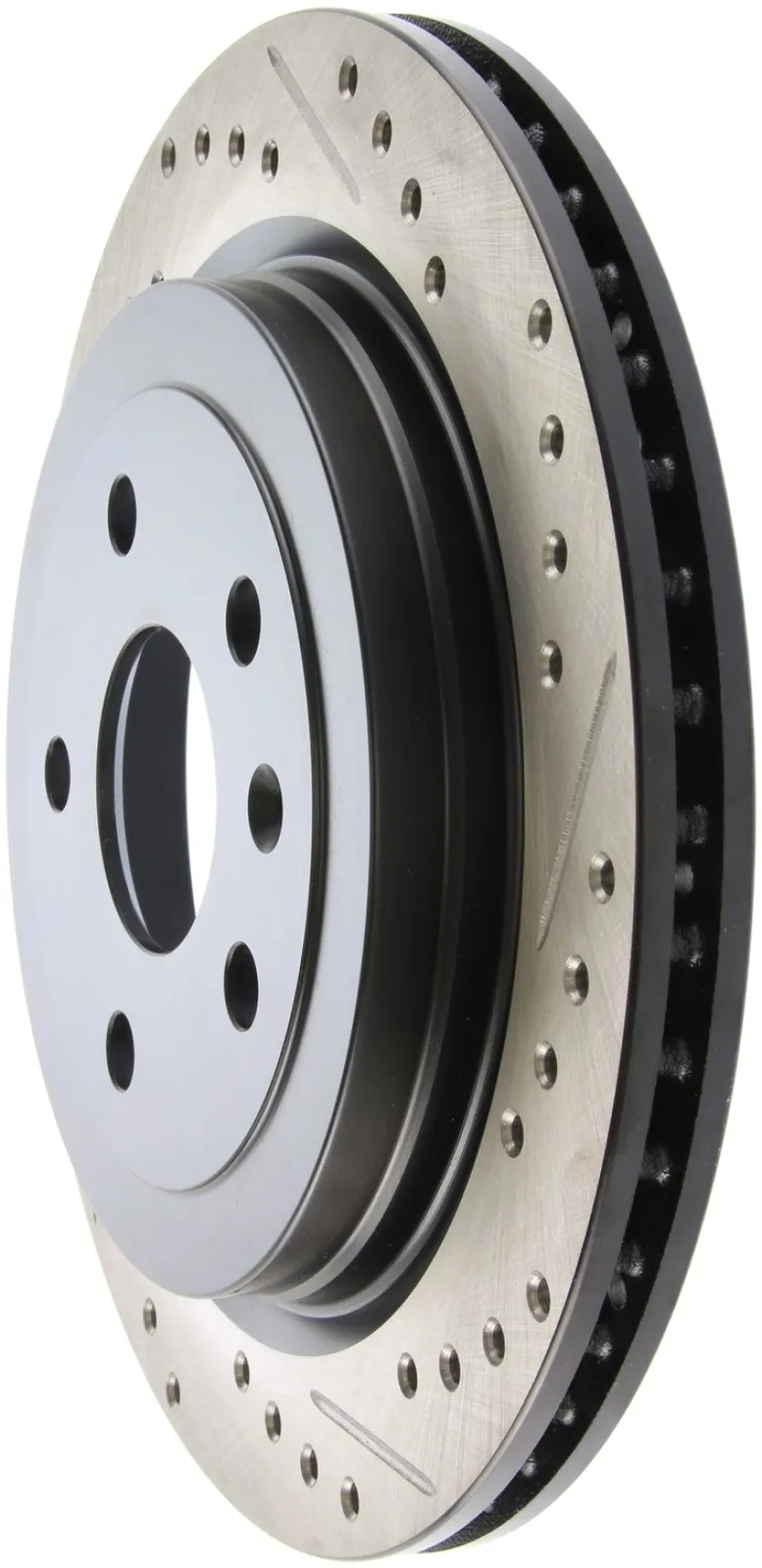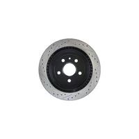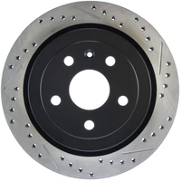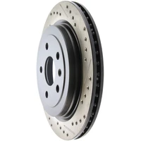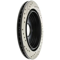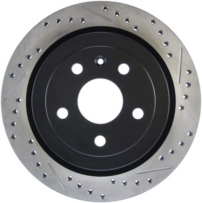 StopTech recognizes that great brakes need to look as good as they perform. Performance wheels and tires are best complemented with StopTech SportStop Cross-Drilled & Slotted rotors. SportStop Drilled & Slotted brake rotors prevent glazing of the pads, add bite and improve wet and dry braking performance. Every SportStop Drilled & Slotted brake rotor is produced from a high quality Centric Parts blank casting and finished in a durable e-coating for corrosion resistance. SportStop Drilled & Slotted rotors look great behind custom wheels, improve the initial bite of the brake pads, and help wipe away the debris that forms between the pad and the disc. A set of SportStop cross-Drilled & Slotted rear replacement rotors is a great way to match the aesthetics of a StopTech Big Brake Kit with the cross-Drilled & Slotted rotor option. *E-Coated Finish* Every SportStop rotor is finished with black e-coating on both sides of the hat, inside the the cooling vanes, and on the outside edge. E-coating is a superior electro-statically applied finish designed to withstand 400 hours of salt water exposure without rusting. This is especially important on both mounting faces of the hat where it touches the hub flange and back face of the wheel. Any accumulation of rust in these area can lead to installed lateral run out issues. *Power Alloy Metallurgy* Power Alloy metallurgy is exclusive feature of SportStop rotors. In specific vehicle applications, StopTech works with foundry partners to increase the molybdenum or carbon content of the castings, and to carefully control the cooling rate during production to reach targets for hardness and tensile strength. *Cooling Vane Design* Nearly all SportStop Cross-Drilled & Slotted rotors have unique Drilled & Slotted hole patterns for the left and right sides of the vehicle. For these directional patterns, straight vane or pillar vane rotors are used to ensure that a Drilled & Slotted hole never touches a cooling vane.