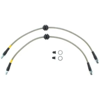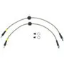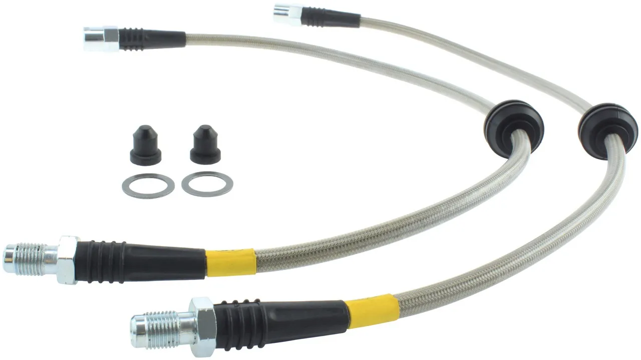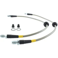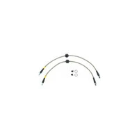 Improve vehicle brake performance and feel with Stoptech Stainless Steel Braided Brake Lines. Stoptech Stainless Steel Braided Brake Lines provide a quicker, firmer, more consistent pedal response by maintaining consistent brake pressure. Additionally, stainless steel lines provide precision brake modulation, especially during threshold braking. The improvement in pedal feel is more dramatic on older vehicles where the factory rubber line may have softened and swelled due to age. StopTech brake lines consist of a PTFE (commonly referred to as Teflon) inner line that carries the brake fluid, which is then covered with a layer of stainless steel woven braid. The PTFE tube is very resistant to expansion under pressure and will not degrade from exposure to brake fluid. The braided stainless steel provides support for the PTFE and the weave is extremely durable against incidental impact and abrasion. Next the stainless braided hose is coated with a clear abrasion resistant PVC cover for maximum protection against chaffing and strain relief devices reinforce end fittings. A variety of end fittings are available to meet most application needs. All fittings are engineered for proper fit and durability. All necessary brackets and fasteners are included with each line kit. *Coated Teflon inner core* StopTech brake lines consist of a PTFE (commonly referred to as Teflon) inner line that carries the brake fluid, which is then covered with a layer of stainless steel woven braid. The PTFE tube is very resistant to expansion under pressure and maintains integrity with exposure to corrosive brake fluid. *Stoptech braided brake lines protect against the elements of harsh driving conditions.* The stainless steel braid provides support for the PTFE and the weave is extremely durable against incidental impact and abrasion. Next the stainless braided hose is coated with a clear abrasion resistant PVC cover for maximum protection against chaffing and strain relief devices reinforce end fittings. *Testing beyond the limit is our quality assurance* Every StopTech brake line is 100% tested in-house to a pressure of 4,500 PSI. This is almost 4 times the typical line pressure exerted by a production vehicle's master cylinder. StopTech is a registered brake line manufacturer with the United States DOT and all StopTech Stainless Steel Brake Lines are manufactured to meet DOT Compliance Standards. StopTech Stainless Steel lines also meet or exceed FMVSS 106 and applicable international and EU standards.