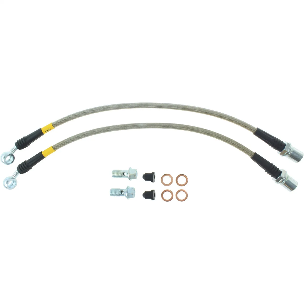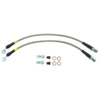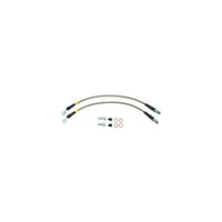 Improve vehicle brake performance and feel with Stoptech Stainless Steel Braided Brake Lines. Stoptech Stainless Steel Braided Brake Lines provide a quicker, firmer, more consistent pedal response by maintaining consistent brake pressure. Additionally, stainless steel lines provide precision brake modulation, especially during threshold braking. The improvement in pedal feel is more dramatic on older vehicles where the factory rubber line may have softened and swelled due to age. StopTech brake lines consist of a PTFE (commonly referred to as Teflon) inner line that carries the brake fluid, which is then covered with a layer of stainless steel woven braid. The PTFE tube is very resistant to expansion under pressure and will not degrade from exposure to brake fluid. The braided stainless steel provides support for the PTFE and the weave is extremely durable against incidental impact and abrasion. Next the stainless braided hose is coated with a clear abrasion resistant PVC cover for maximum protection against chaffing and strain relief devices reinforce end fittings. A variety of end fittings are available to meet most application needs. All fittings are engineered for proper fit and durability. All necessary brackets and fasteners are included with each line kit. *Coated Teflon inner core* StopTech brake lines consist of a PTFE (commonly referred to as Teflon) inner line that carries the brake fluid, which is then covered with a layer of stainless steel woven braid. The PTFE tube is very resistant to expansion under pressure and maintains integrity with exposure to corrosive brake fluid. *Stoptech braided brake lines protect against the elements of harsh driving conditions.* The stainless steel braid provides support for the PTFE and the weave is extremely durable against incidental impact and abrasion. Next the stainless braided hose is coated with a clear abrasion resistant PVC cover for maximum protection against chaffing and strain relief devices reinforce end fittings. *Testing beyond the limit is our quality assurance* Every StopTech brake line is 100% tested in-house to a pressure of 4,500 PSI. This is almost 4 times the typical line pressure exerted by a production vehicle's master cylinder. StopTech is a registered brake line manufacturer with the United States DOT and all StopTech Stainless Steel Brake Lines are manufactured to meet DOT Compliance Standards. StopTech Stainless Steel lines also meet or exceed FMVSS 106 and applicable international and EU standards.