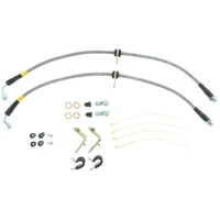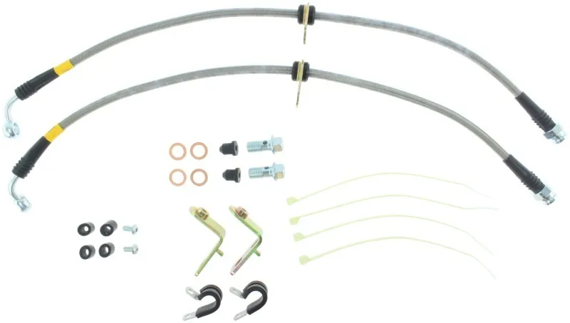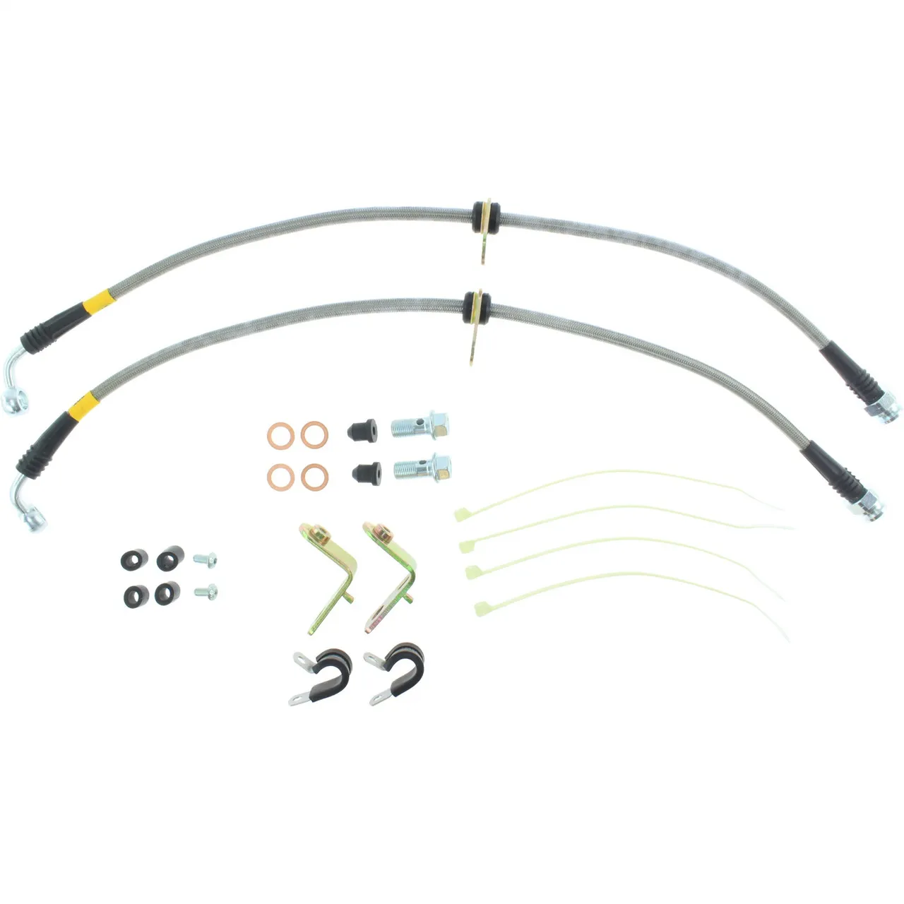 Improve vehicle brake performance and feel with Stoptech Stainless Steel Braided Brake Lines. Stoptech Stainless Steel Braided Brake Lines provide a quicker, firmer, more consistent pedal response by maintaining consistent brake pressure. Additionally, stainless steel lines provide precision brake modulation, especially during threshold braking. The improvement in pedal feel is more dramatic on older vehicles where the factory rubber line may have softened and swelled due to age. StopTech brake lines consist of a PTFE (commonly referred to as Teflon) inner line that carries the brake fluid, which is then covered with a layer of stainless steel woven braid. The PTFE tube is very resistant to expansion under pressure and will not degrade from exposure to brake fluid. The braided stainless steel provides support for the PTFE and the weave is extremely durable against incidental impact and abrasion. Next the stainless braided hose is coated with a clear abrasion resistant PVC cover for maximum protection against chaffing and strain relief devices reinforce end fittings. A variety of end fittings are available to meet most application needs. All fittings are engineered for proper fit and durability. All necessary brackets and fasteners are included with each line kit. *Coated Teflon inner core* StopTech brake lines consist of a PTFE (commonly referred to as Teflon) inner line that carries the brake fluid, which is then covered with a layer of stainless steel woven braid. The PTFE tube is very resistant to expansion under pressure and maintains integrity with exposure to corrosive brake fluid. *Stoptech braided brake lines protect against the elements of harsh driving conditions.* The stainless steel braid provides support for the PTFE and the weave is extremely durable against incidental impact and abrasion. Next the stainless braided hose is coated with a clear abrasion resistant PVC cover for maximum protection against chaffing and strain relief devices reinforce end fittings. *Testing beyond the limit is our quality assurance* Every StopTech brake line is 100% tested in-house to a pressure of 4,500 PSI. This is almost 4 times the typical line pressure exerted by a production vehicle's master cylinder. StopTech is a registered brake line manufacturer with the United States DOT and all StopTech Stainless Steel Brake Lines are manufactured to meet DOT Compliance Standards. StopTech Stainless Steel lines also meet or exceed FMVSS 106 and applicable international and EU standards.