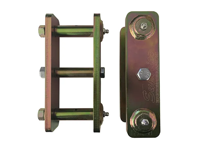 Superior Engineering is the only Company that incorporates the welded pins into our design and this totally stops any sideways flexing that ultimately will lead to the shackle failure and premature wear of the shackle plates and they also incorporate the 'Step Bolt' design so the shackles can be properly tightened to ensure the exact tolerance between the bushes in maintained.