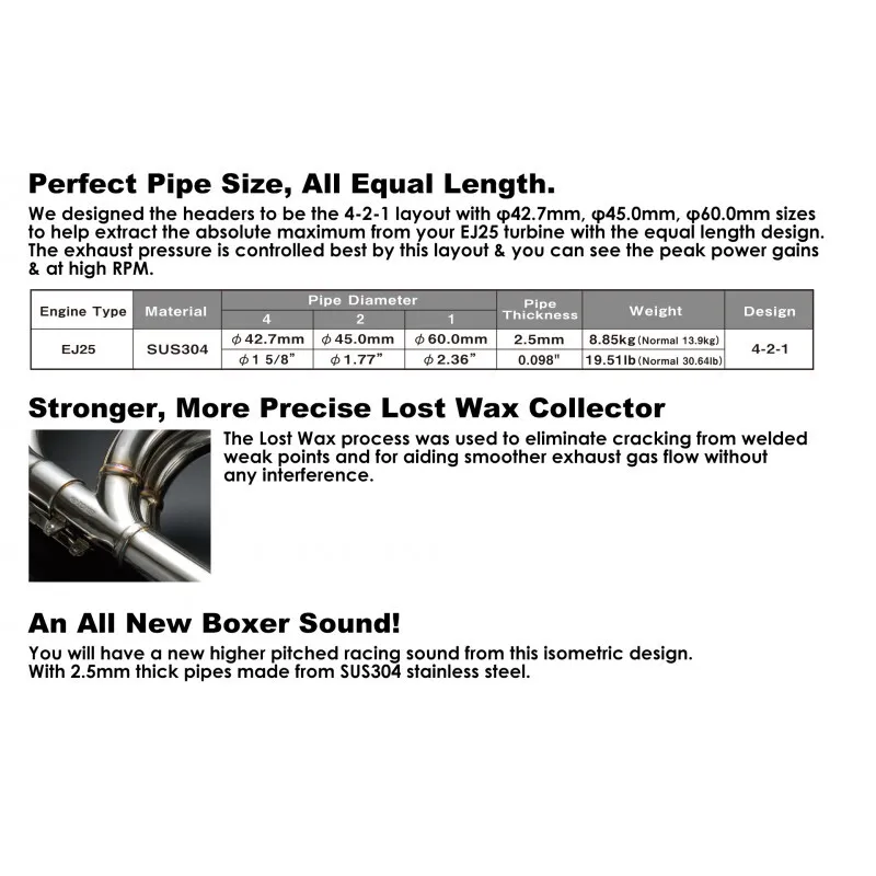 • Perfect Pipe Size, All Equal Length - We designed the headers to be the 4-2-1 layout with ?42.7mm, ?45.0mm, ?60.0mm sizes to help extract the absolute maximum from your EJ25 turbine with the equal length design. The exhaust pressure is controlled best by this layout & you can see the peak power gains & at high RPM.