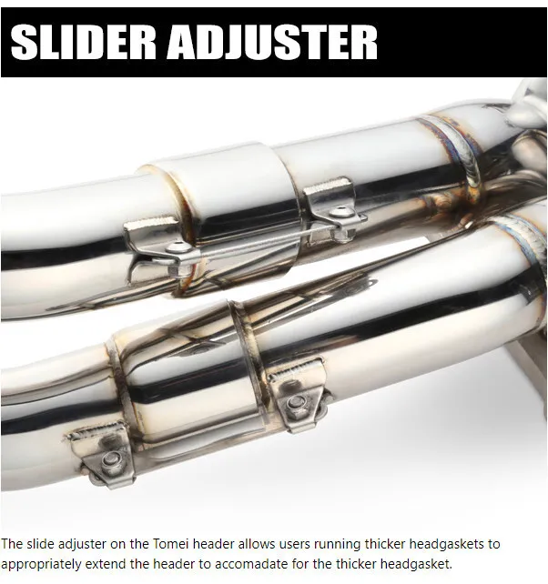 • SLIDE ADJUSTER - The slide adjuster on the Tomei header allows users running thicker headgaskets to appropriately extend the header to accomadate for the thicker headgasket.