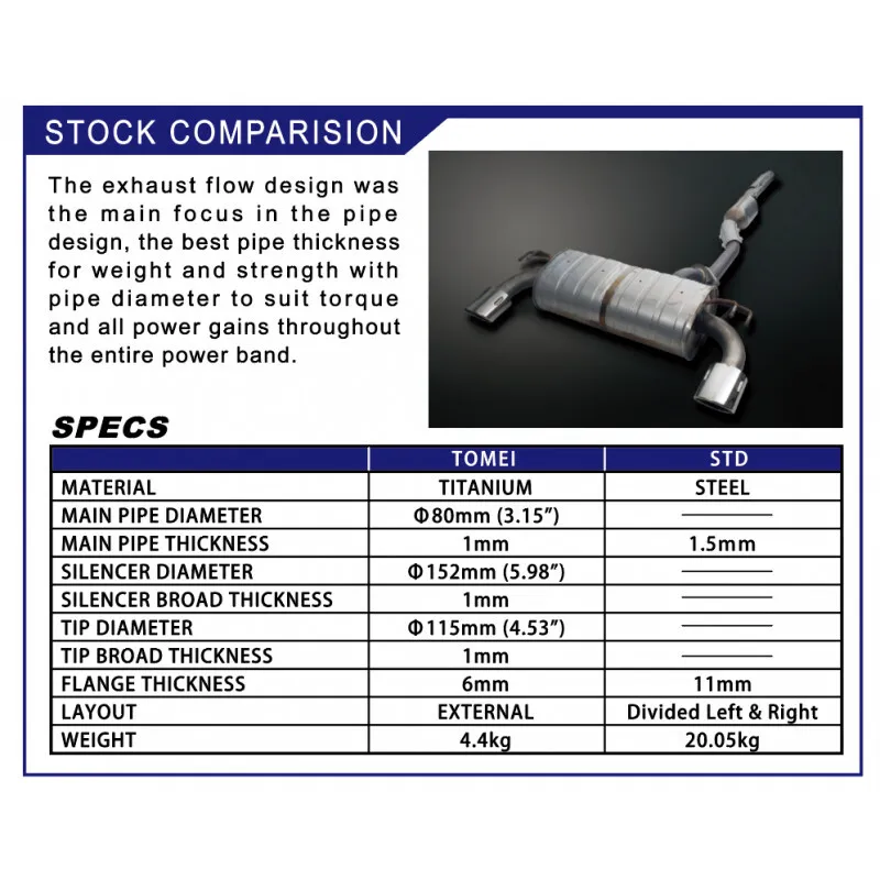 • SILENCER CASE- This part is made from Titanium with the pipe size of ?152 and 1mm thickness. The oversized shell design optimizes exhaust gas flow which helps with power gains. Then with the embossed Tomei logo and beautiful heat gradation colouring gives it the finishing touch that you'd expect.