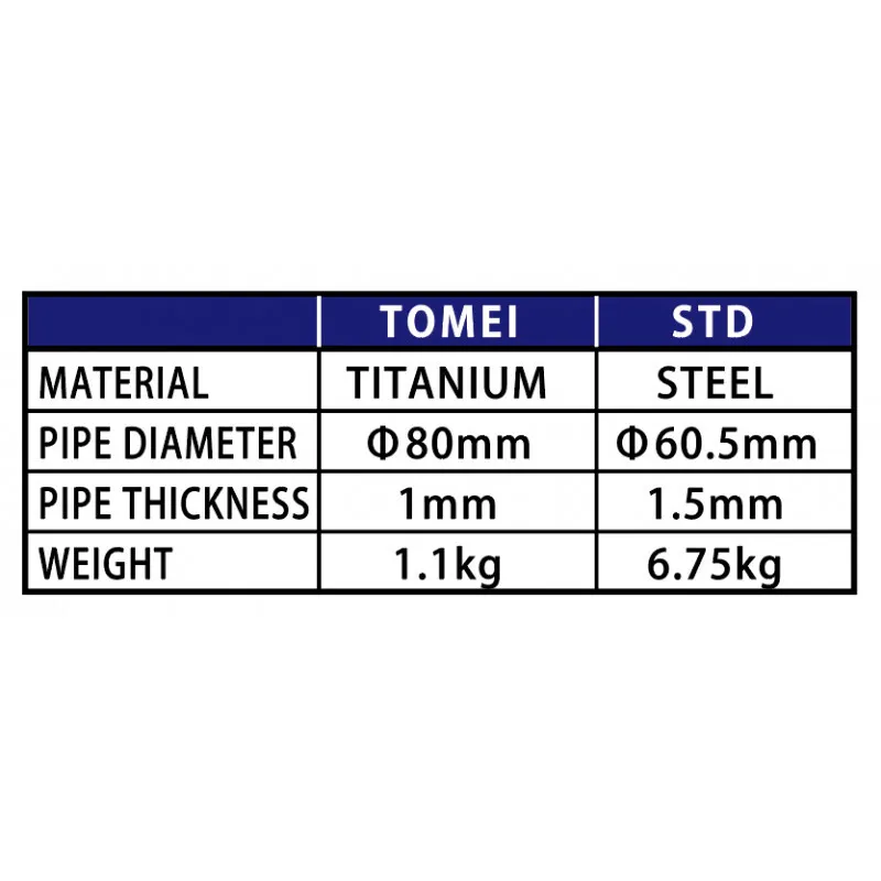 • SILENCER CASE- This part is made from Titanium with the pipe size of ?152 and 1mm thickness. The oversized shell design optimizes exhaust gas flow which helps with power gains. Then with the embossed Tomei logo and beautiful heat gradation colouring gives it the finishing touch that you'd expect.
