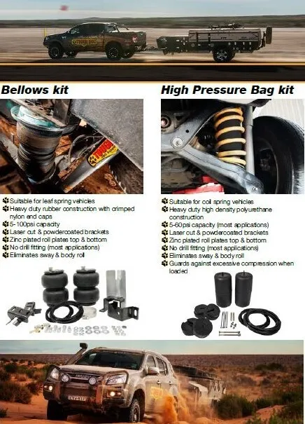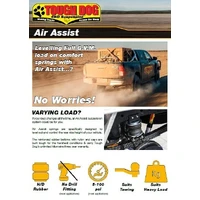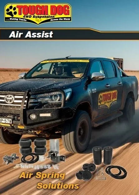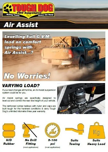 If your load changes all the time, an Air Assist suspension system could be for you.  Air Assist springs are specifically designed to level out and control the rear ride height of your vehicle.  The reinforced rubber bellows with nylon end caps are built tough for the harshest conditions & carry Tough Dog’s unlimited kilometre three year warranty.