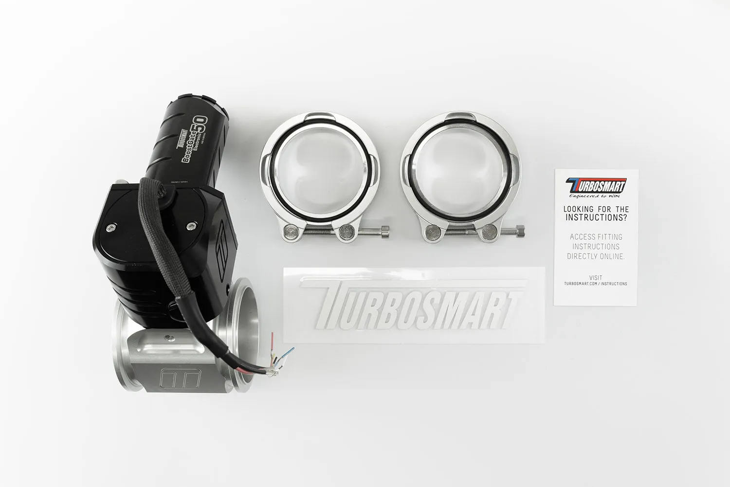 Turbosmart BoostGate50 is an electronically controlled butterfly style valve designed for charge pipe boost control. The BoostGate is manufactured from Billet Aluminum for reduced mass and features the kind of control and flow you've come to expect from the StraightGate series of Turbosmart products. Unlike a traditional external wastegate which bypasses gas around the turbine housing aiming to reduce turbocharger shaft speed and effectively, boost levels - Charge Air control is a controlled bleed of the compressed air on the cold-side of the turbocharger system. Mounted to the charge pipe, the BoostGate can be used to modulate this air flow directly, rather than the indirect method of traditional control. Charge-Air Control is specifically suited to applications such as drag racing where turbocharger specifications have already been optimized and the turbine is not the limiting factor in performance. The BoostGate50 is a zero offset butterfly styled valve which enables incredible resolution, enormous flow and the kind of boost control required to deliver the perfect pass, every time. Equipped with the Patent Pending Zero-Backdrive gearbox technology to reduce overall power consumption and maximize response, the BoostGate50 is Engineered to Win!