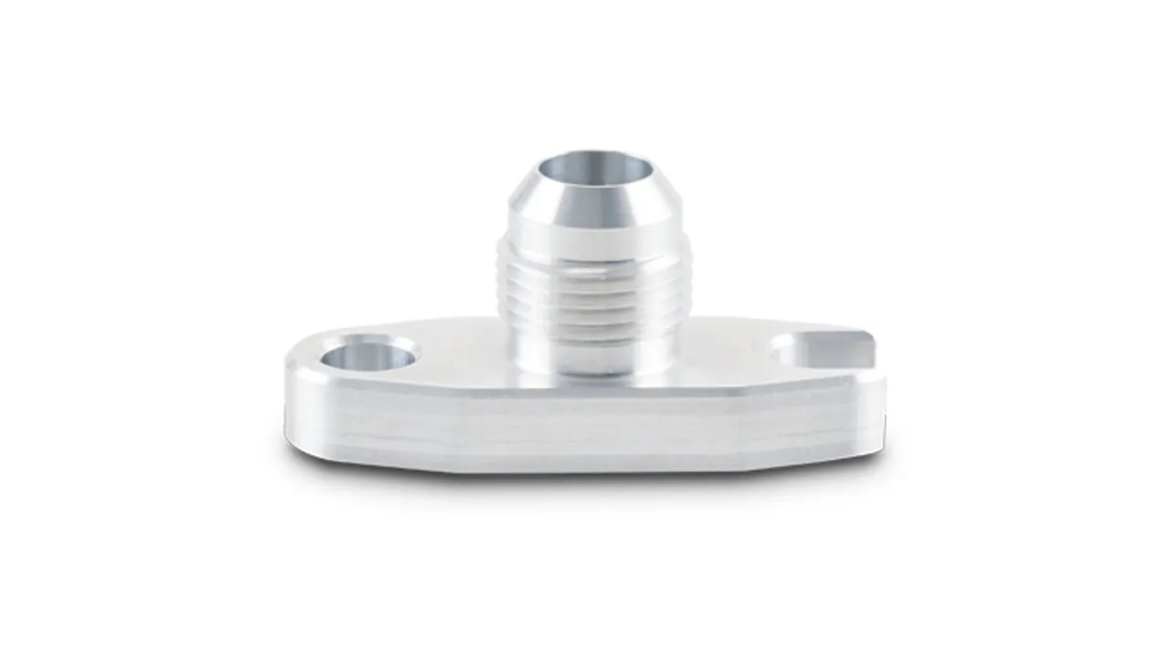 Vibrant Performance Oil Drain Flanges feature 6061 Aluminum construction and includes a pair of M8 x 1.25 button-head cap screws. Each flange has a Crowfoot added on one side to make installation and removal easier.