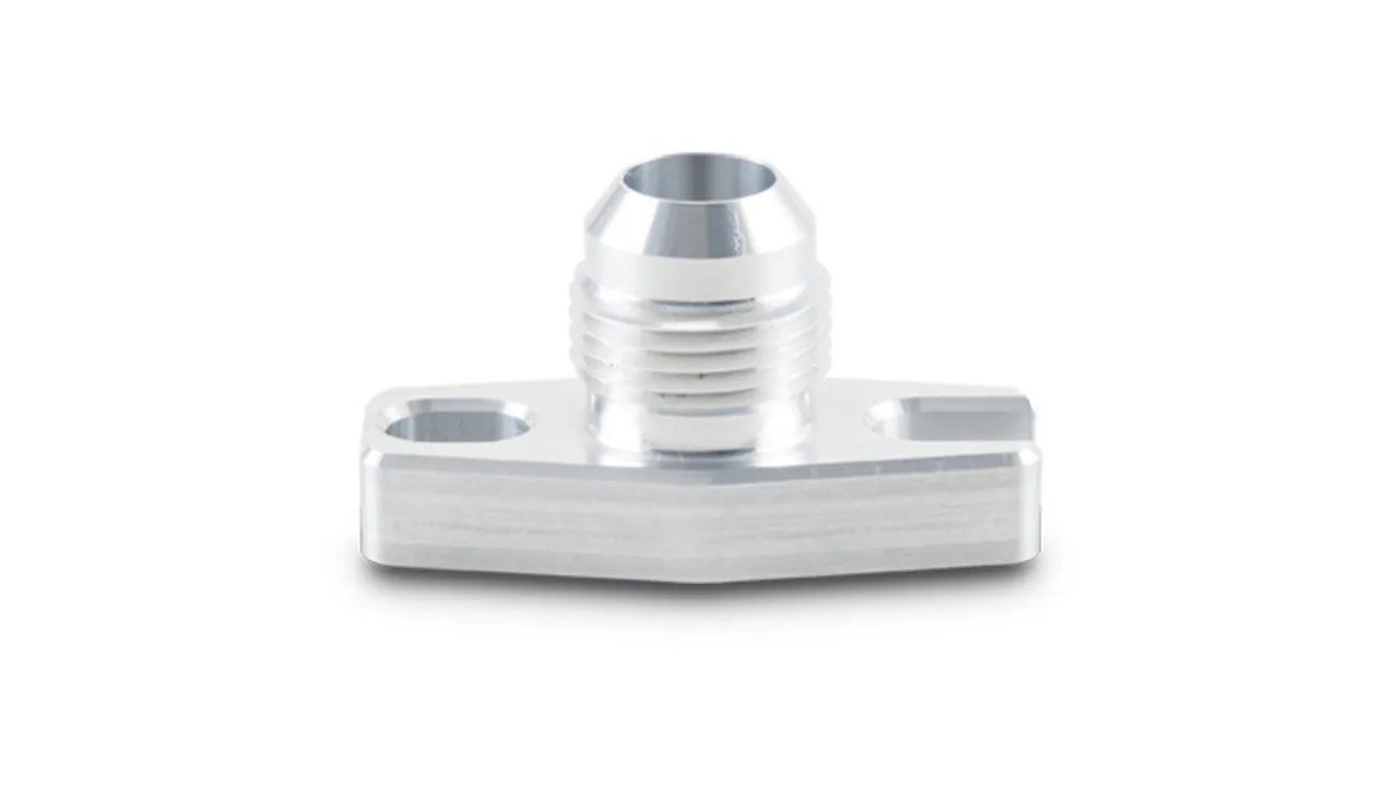 Vibrant Performance Oil Drain Flanges feature 6061 Aluminum construction and includes a pair of M8 x 1.25 button-head cap screws. Each flange has a Crowfoot added on one side to make installation and removal easier.