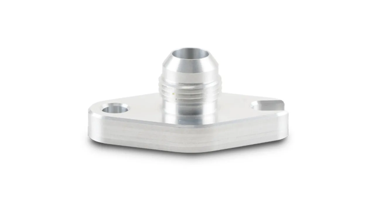 Vibrant Performance Oil Drain Flanges feature 6061 Aluminum construction and includes a pair of M8 x 1.25 button-head cap screws. Each flange has a Crowfoot added on one side to make installation and removal easier.