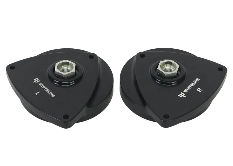 Whiteline offset strut tops allow for extra negative camber and positive caster to improve steering response, steering feel and reduced movement to ensure wheel alignment stability through a high quality spherical bearing. Perfect for the high performance street or track day weapon, providing improved tyre life and extra grip during high speed / high load cornering. Providing an addition +0.5 Deg of caster / -1.0 Deg of camber.