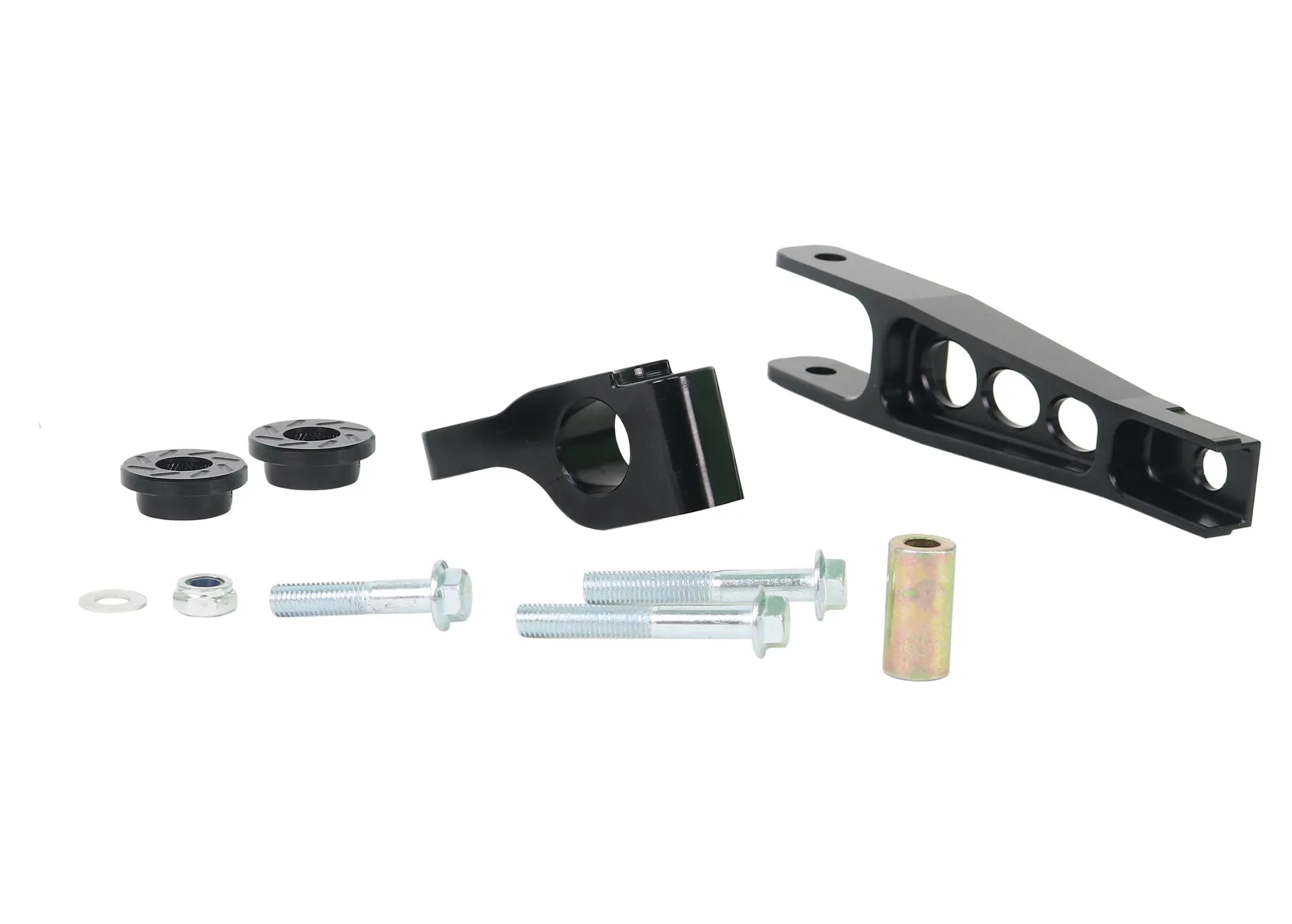 The torque arm assists in controlling the engine and drivetrain forward and aft twisting motion. The torque arm is inherently soft due to the high compliance rubber bushing design and was built for comfort and not responsiveness or feel. Whiteline's torque arm mount bushing is built to handle the demands of high torque and power output engines by limiting the amount of movement the engine and drivetrain will place upon the pitch stop. Utilising low compliance bushing technology this eliminates the slop, twisting and shudder found in the OEM rubber bushings allowing for a faster, positive, responsive feel of power delivery on and off the throttle.