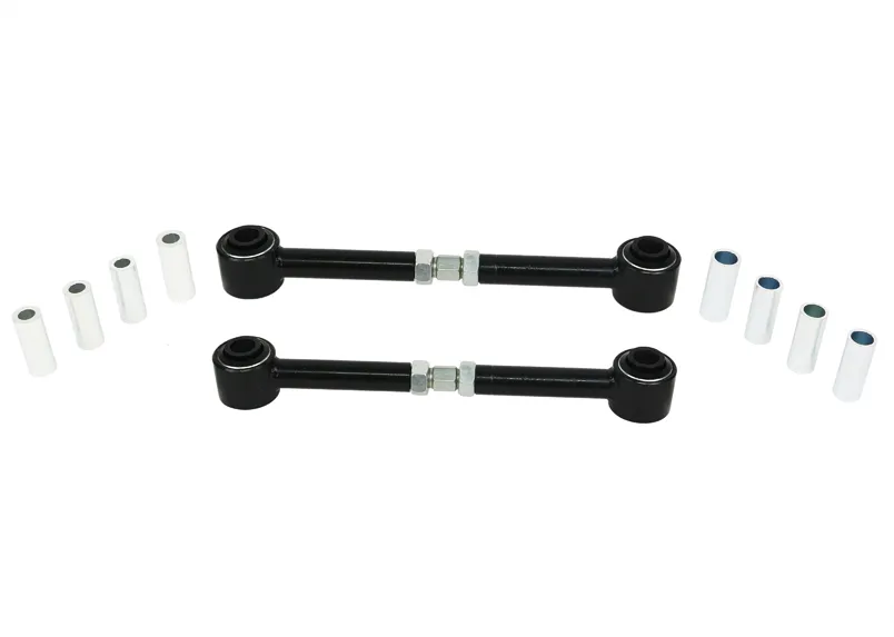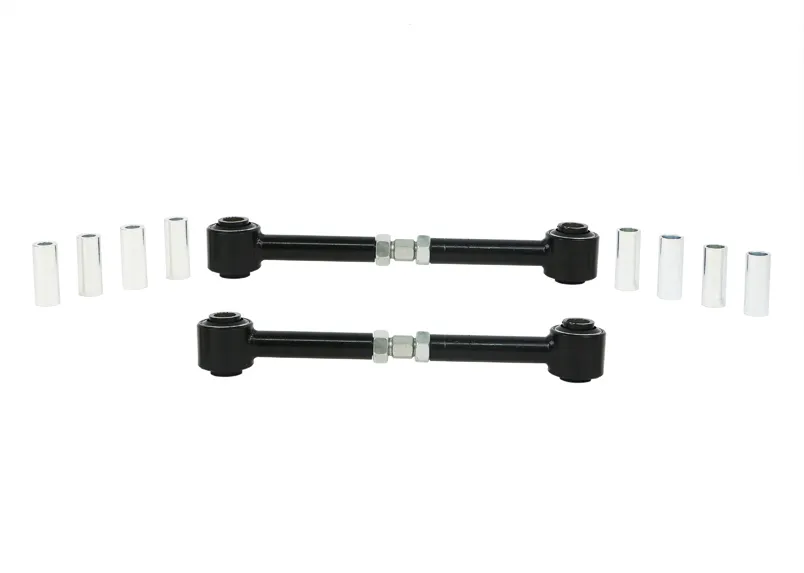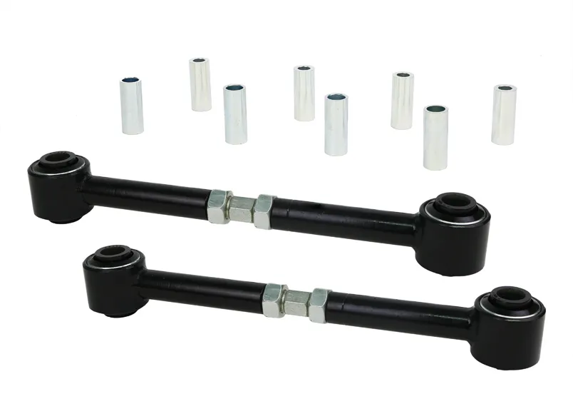 Heavy duty turnbuckle adjustable trailing arms provides incremental on car adjustability of differential pinion angle. This allows you to dial in more or less traction under heavy acceleration.