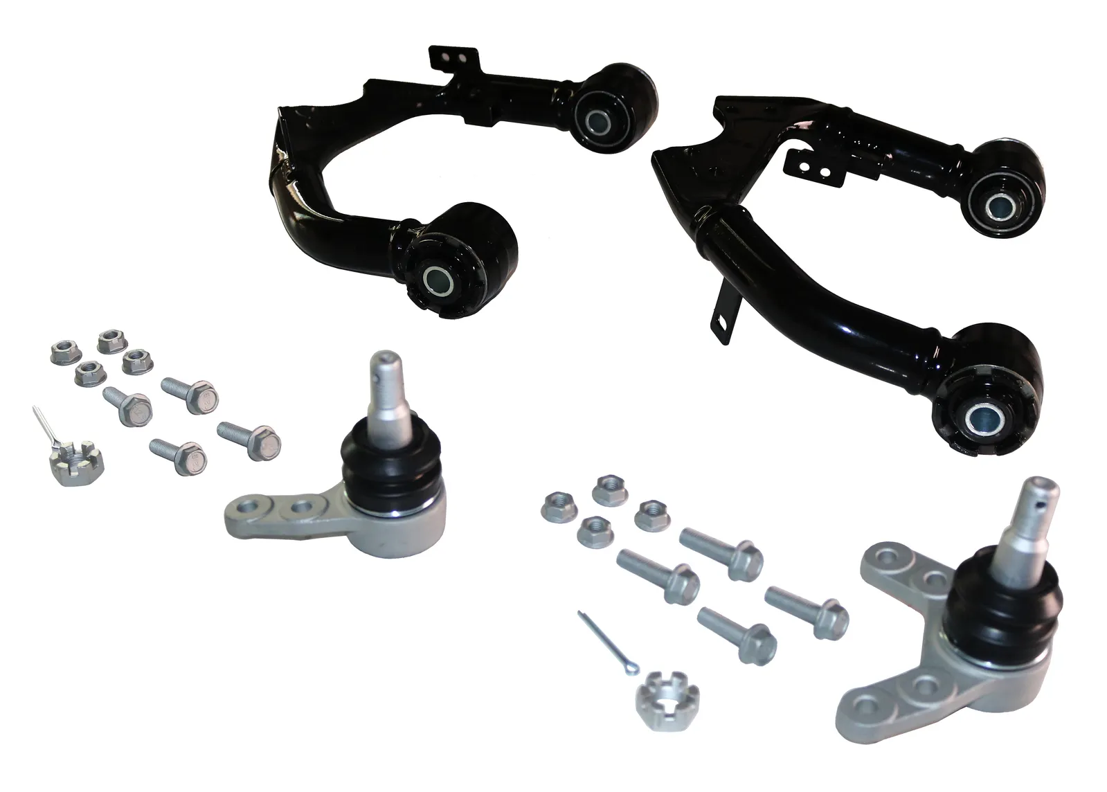 • A short fall of the modern day IFS 4wd is the adjustment range provided for successful wheel alignments, this becomes even more of an issue when the vehicle is lifted by more than 1 inch. Not only does the vehicle run into camber and caster issues, but ball joint articulation and clearance issues to the coil over strut at ride and droop height. The new Whiteline offset UCA (Upper Control Arm) is an all-in-one solution for any vehicle that has been lifted between 30mm and 70mm. Providing an increase between +2.5 and +3.5 degrees of caster and up to 1.5 degrees of negative camber increase (figures quoted are based off an approximate 50mm/ 2 inch) along with greater clearance to the coil over strut and more articulation of the arm by virtue of new maintenance free GIIRO bushing technology.
